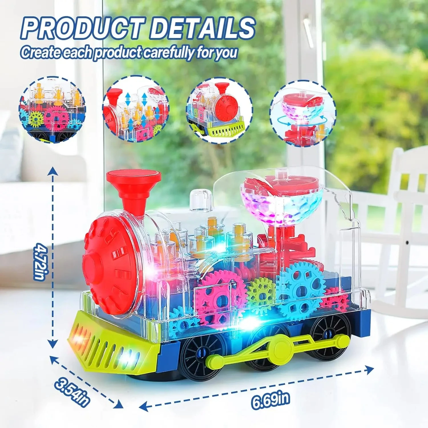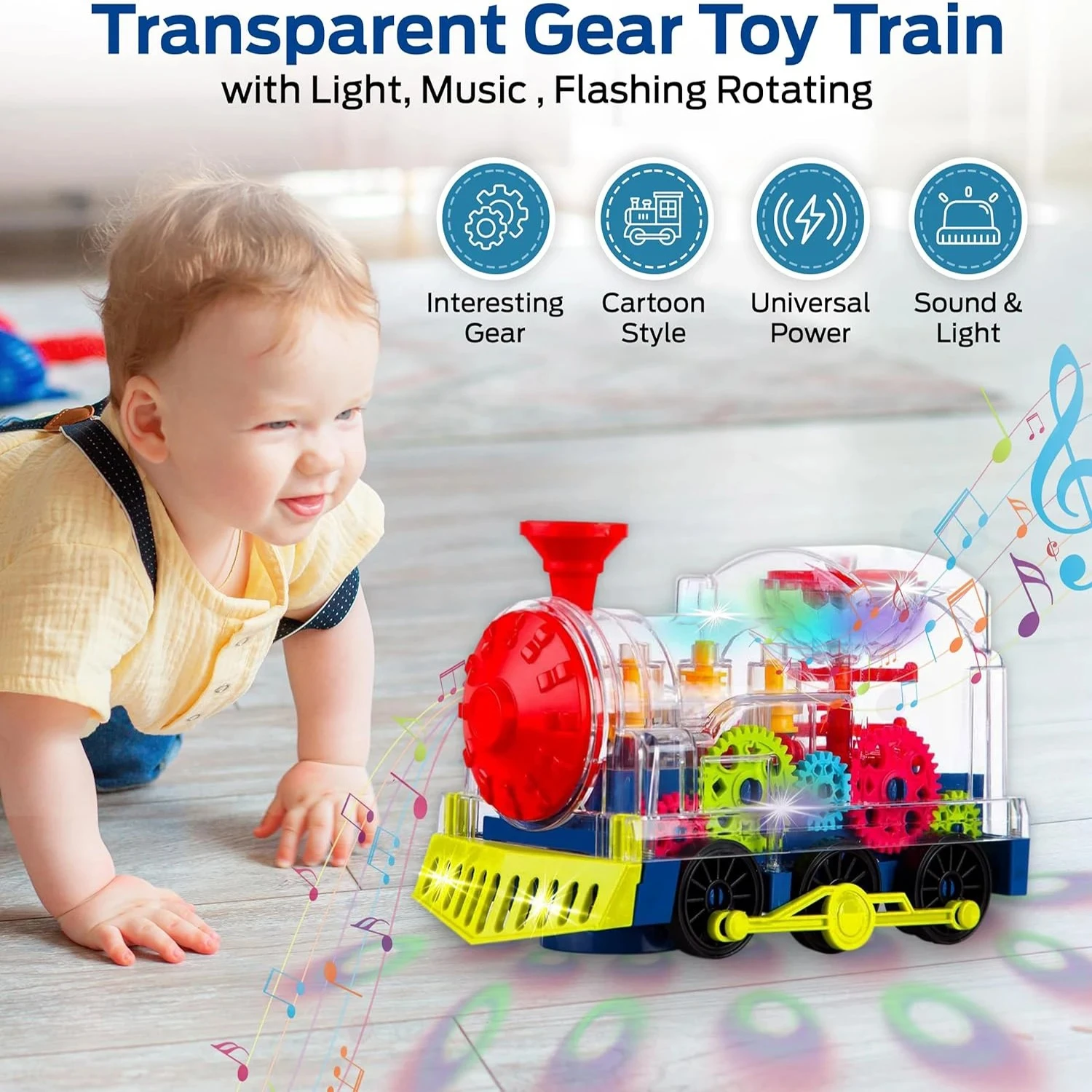 Light Up Train Toy for Kids, Transparent Gear Car Toy with Cool Light and Music, Early Educational Crawling Toys for Baby Christmas Gifts and Birthday Party (Shipping without batteries, and the buyer needs to install 3 No. 5 batteries by yourself to use) |