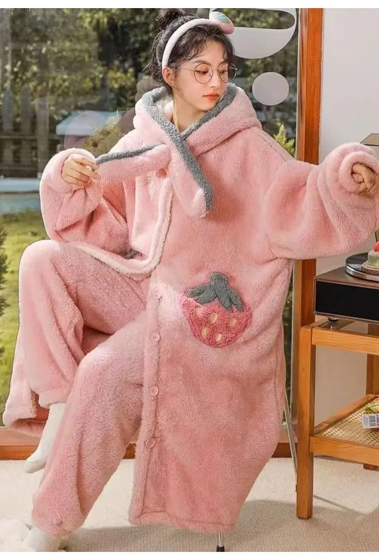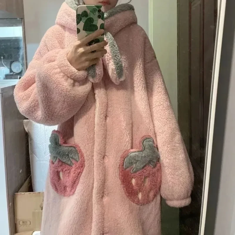 Strawberry Robe Women Sleepwear Fleece One Piece Pajama Winter Nightdress Night Wears Warm Nightgown Hooded Sleeping Homewear
