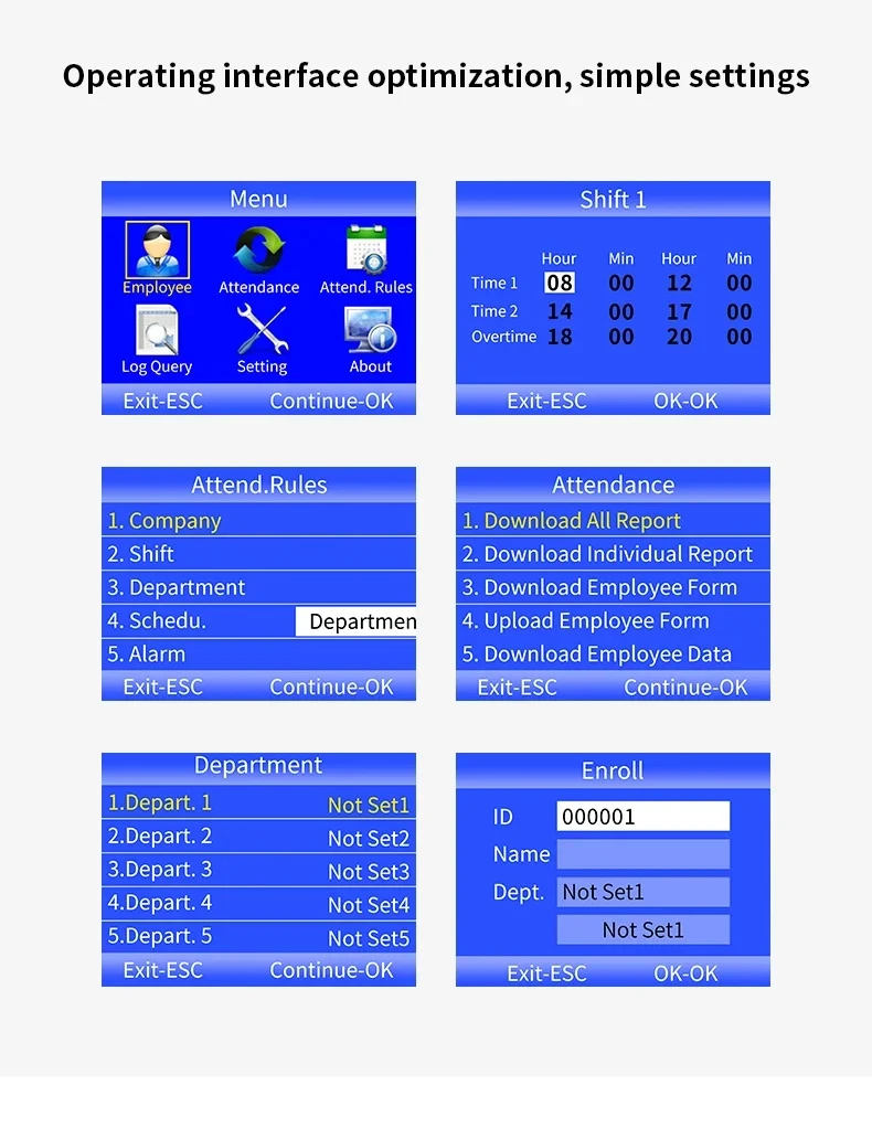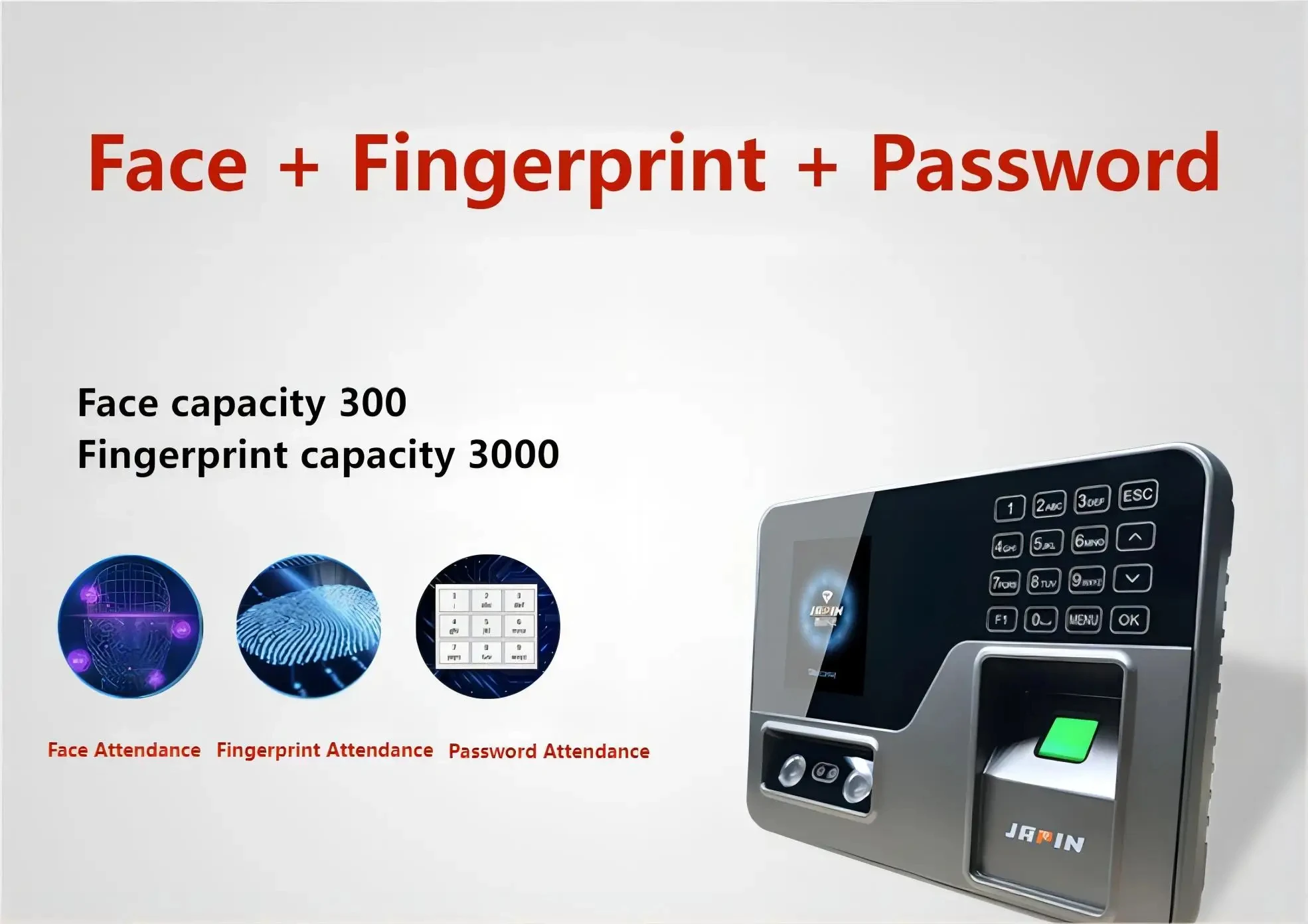 1.2.8' TFT color screen; 16-bit film touch buttons, T9 Chinese and English input method and display (multiple languages can be customized); Standard configuration: Chinese, English; 2. Fingerprint + face + password and a combination of the three methods; 3. Storage capacity: 300 faces; 3,000 fingerprints; 100,000 attendance records; 4. Communication method: U disk upload and download data; 5. Attendance report: Software-free self-service attendance, U disk exports attendance details and attendance statistics table; 6. True rejection rate (FRR): ≤0.01%; False recognition rate (FAR): ≤0.0001%; Setting mode: 1 :1,1:N; matching speed: ≤1.0 seconds 7.Power supply: 5v/1A |