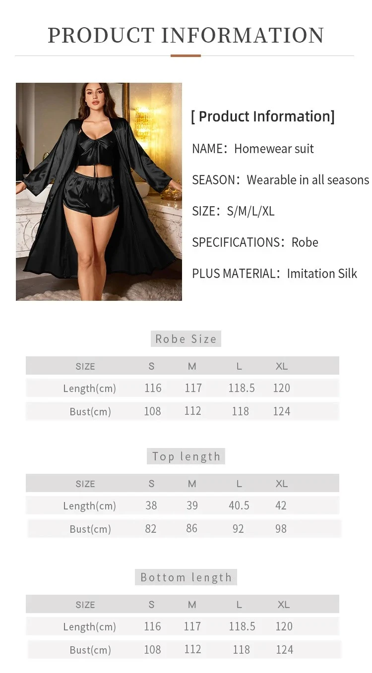 Material: Faux SilknSeason: SummernPattern Type: SolidnSleeve Length: FullnDresses Length: Above Knee, MininGender: Womennnn**Elegant Design and Comfort**nStep into the world of luxury with our 3-piece sexy pajamas set, crafted from luscious faux silk for a touch of elegance and comfort. The solid pattern and full sleeves offer a classic aesthetic that is perfect for the summer season. The mini-length dresses are designed to be above the knee, providing a sultry yet comfortable fit for women who desire a blend of style and relaxation. The satin material ensures a smooth, silky feel against the skin, making it an ideal choice for those who value both comfort and sophistication.nn**Versatile and Practical**nWhether you're lounging at home or enjoying a romantic evening, these sexy nightgowns and satin robes are versatile enough to suit any occasion. The belted design with contrast binding adds a touch of elegance, while the V-neck and full sleeves offer a modest yet alluring silhouette. The set includes a sling and short robe, giving you the option to dress up or down depending on your mood. The non-stretch fabric ensures a flattering fit, making it a staple for any woman's wardrobe. Easy Care and Durability. Care for your sexy nightgowns with ease; our satin robes are machine washable or suitable for a professional dry clean. The high-quality polyester composition ensures durability, and the set's competitive factory price, adequate stocks, and fast delivery make it a practical choice for those seeking a blend of style and practicality. Elevate your nighttime routine with this 3PCS Sexy Women Pajamas Ladies Nightgowns Satin Robes Nightdress Sling and Short Women Robe set, designed to cater to the modern woman's desire for both comfort and allure. |