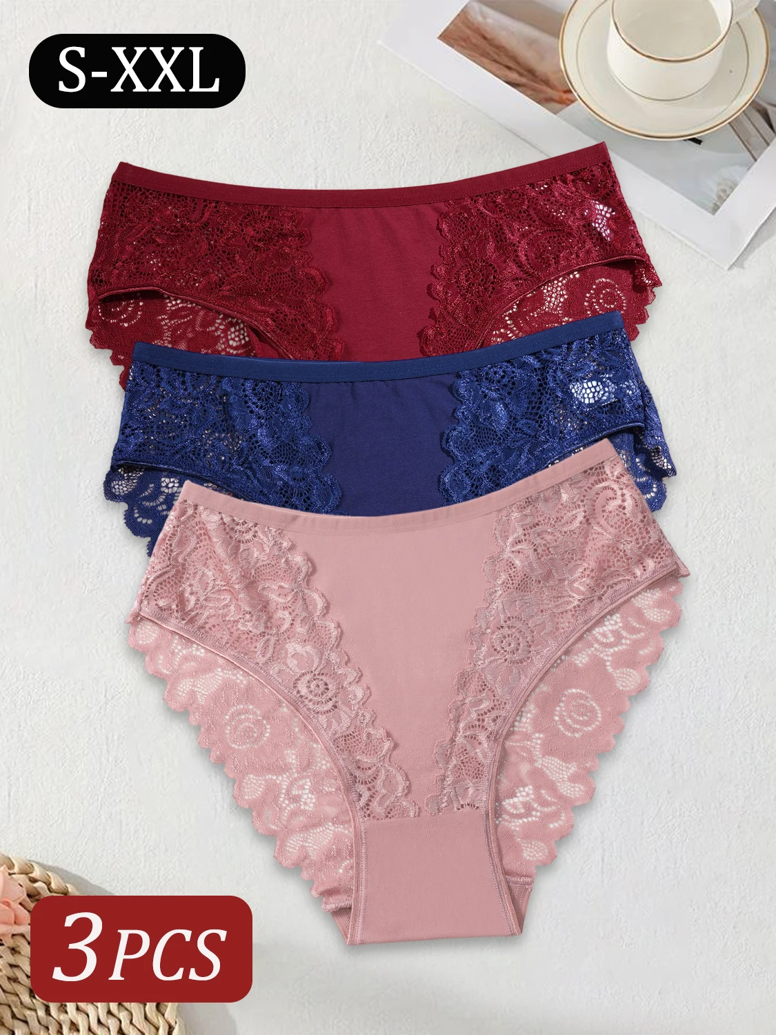 3PCS Solid Color Lace Underwear for Women Sexy Hollow Out Floral Lace Cotton Splicing Panties Elegant Female Comfortable Briefs