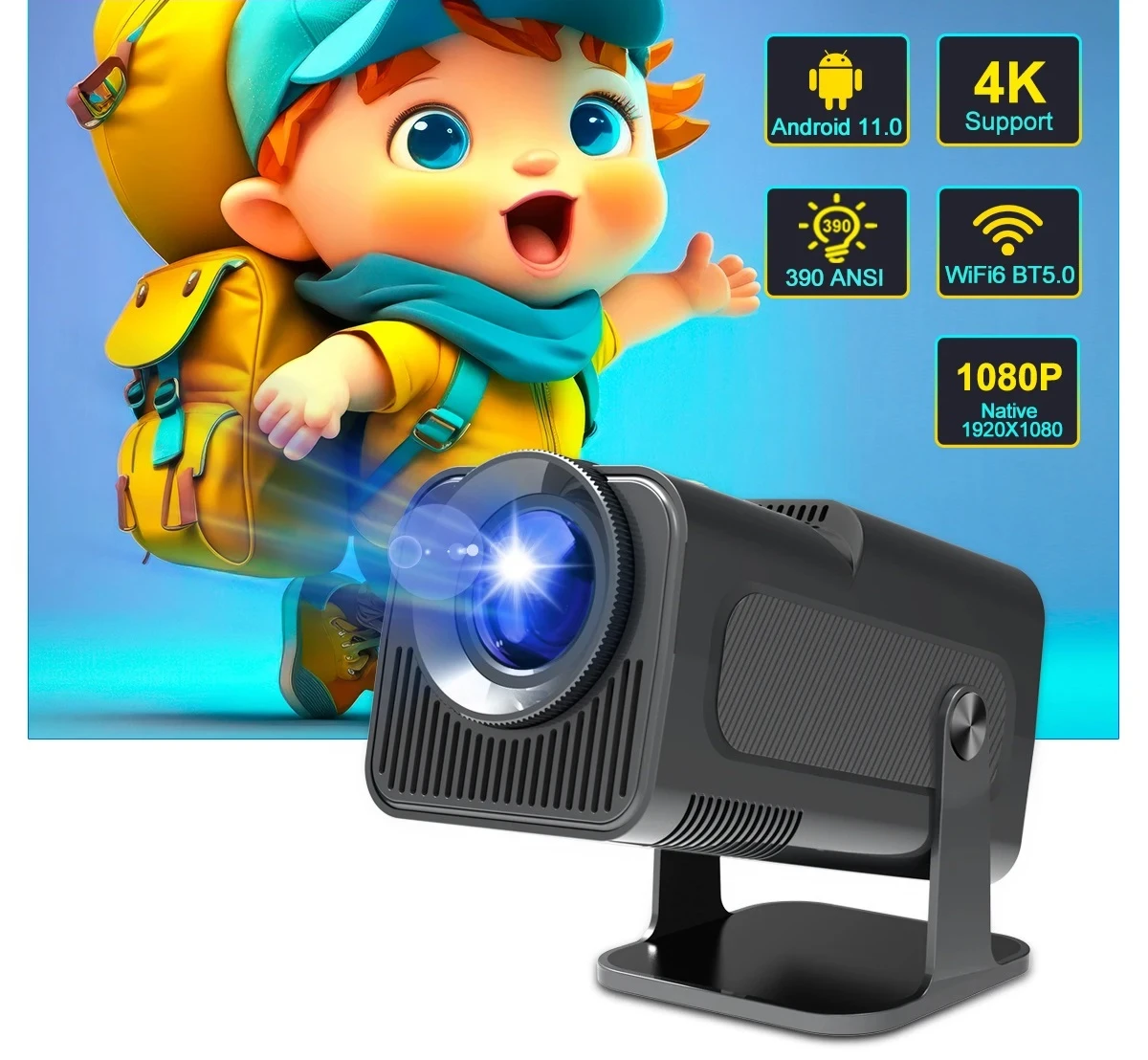 Product Description OS: Android 11.0 Product FeaturesNative 1080P Full HD ResolutionIf you have a high requirement for clarity of projector, this Full HD projector must be your favorite. With a resolution of 1920*1080, a brightness of 10000 lumens, and a dynamic contrast ratio of up to 10000:1, the projector shows a clearer, brighter, and richer picture BT 5.0 Function and HiFi Stereo SpeakersThe projector's built-in dual HiFi stereo surround speakers restores the original audio fidelity, allowing you to experience an excellent listening experience without connecting external speakers. The BT projector can connect headphones, speakers and other audio equipment through it, and you can experience the cinema-level surround effect at home. 150'' Giant ScreenThe portable projector provides a 30-150-inch projection display at a projection distance of 1-4 m, with a 16:9 aspect ratio, optimal viewing in both home theaters and outdoor movies! No latency Ultra-fast WiFi 6 2.4G/5G Dual Band WiFiThe projector uses industry-leading WiFi 6 technology, the transmission is faster and more stable. Enjoy a smooth viewing and gaming experience! You can use wireless screen mirroring through Miracast and Airplay Pls note our projector can support 4K video decode, but the output video's highest resolution is 1920*1080P Specifications