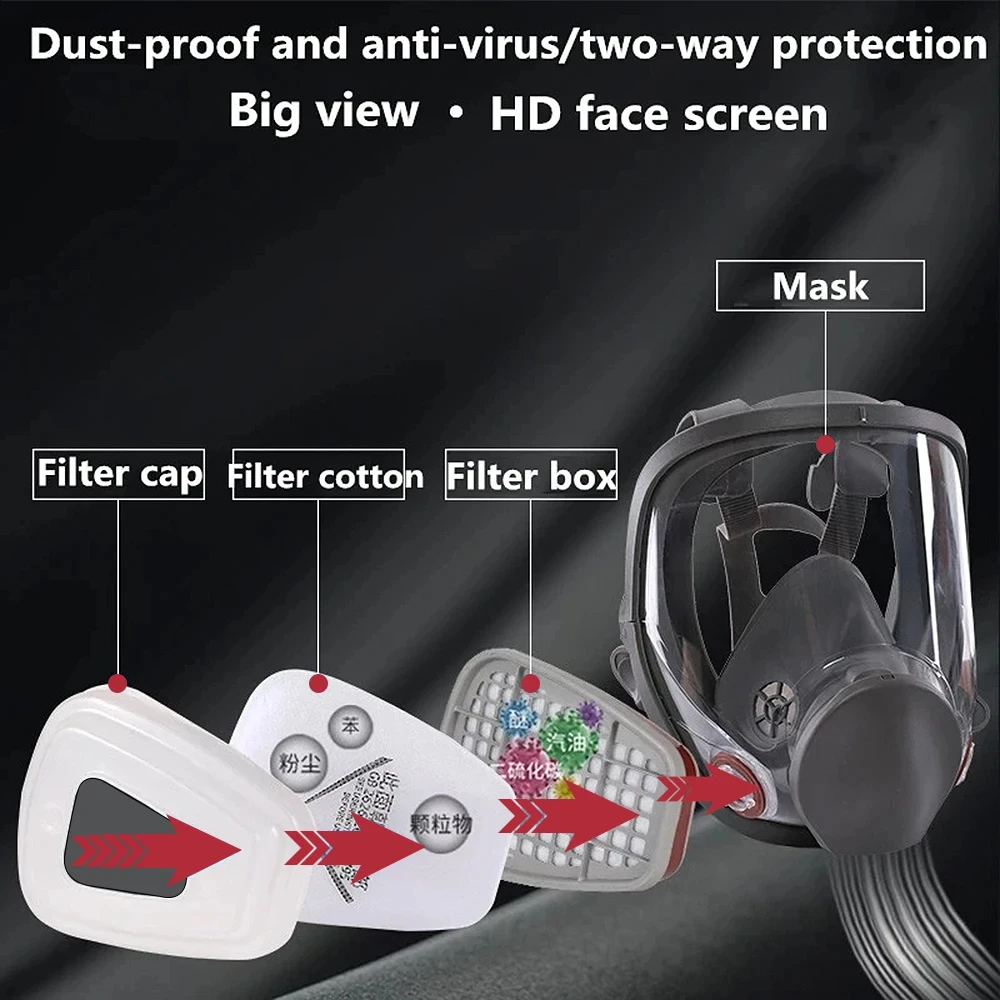 • Ammonia Defense :Designed to defend against ammonia, this gas mask provides full face protection, ensuring your safety in environments with high ammonia levels. • Work Use :Ideal for work use, this gas mask is perfect for industries that involve spraying, painting, or handling chemicals, offering superior protection. • Formaldehyde Protection :This gas mask also provides protection against formaldehyde, making it a valuable tool in environments where this dangerous substance may be present. • Dust Filter :Equipped with a dust filter, this gas mask effectively prevents dust particles from entering your respiratory system, ensuring your health and safety. • Full Face Protection :With its full face protection design, this gas mask provides complete coverage, safeguarding your eyes, face, and lungs from harmful chemicals and particulate matter. • Origin : Mainland China Presentation• 6800 Anti-Fog Gas Mask: The 6800 Anti-Fog Gas Mask ensures clear vision when exposed to hazardous chemicals, making it easier to work safely. • Industrial Paint Spray Respirator: The industrial paint spray respirator provides protection against dust, vapors, and other hazardous chemicals, making it ideal for industrial painting and spraying. • Full Formaldehyde Protection: The full formaldehyde protection feature ensures that the entire face is protected from formaldehyde exposure, making working with hazardous chemicals safer. • Safety Work Filter: The safety work filter effectively filters out harmful chemicals, ensuring that the air you breathe is clean and safe. Filter Cartridge Protection ObjectsBox 3: Organic gases and vapour, benzene, ketone, carbon disulfide, etc Box No. 4: Ammonia, hydrogen sulphide, etc. Box No. 7: Acid gas in steam, sulphur dioxide, chlorine, hydrogen sulfide, nitrogen oxides, etc. Characteristic:Facepiece Full RespiratorLarge lens for a wide field of viewLightweight, balanced designSilicone faceseal for comfort and durabilitySpecifications:• Connection Type: Bayonet• Facepiece Type: Full Reusable Facepiece• Harness type: 4 points• Mission Type: Planes, Ships, Vehicles• Type of operation: Facility safety, maintenance, repair and operation, overhaul• Main material: Silicone thermoplastic elaomer• Product Type: Full Facepiece• Recommended Application: Assembly & Mechanical, Chemical Cleaning, Chemical Handling, Chemical Splashing, Chipping, Chiseling, Cleaning, Kiln Operations, Grinding, Labs, Machining, Painting, Casting/Casting, Sanding, Sawing, UV Protection, WeldingRecommended Industry: Agriculture, Automotive, Chemicals, Construction, General Manufacturing, Mining, Oil & Gas, Pharmaceuticals, Primary Metals, TransportationOne. Instructions for use:1. Hold the end of the strap with both hands and pull the strap so that the mask can completely cover the upper nose and mouth area, and attach the clip to the back of the neck so that the mask is closed to the face. 2. Pull the end of the strap again to tighten further. 3. Before use, check the mask to determine if it is properly sealed. 4. During use, when the user smells the smell or the inhalation resistance increases, the service life of the filter box has arrived, please replace the filter box or cotton filter immediately. Two. Special Considerations for Users1. Please do not use this mask when the oxygen concentration is less than 18%. 2. Please refrain from using it in the following cases. Hazardous substances are not disclosed The concentration of hazardous substances reaches a concentration that immediately endangers life and health. When you smell or taste harmful substances. 3. Pre-use training should be conducted by a qualified person prior to use. 4. When not in use, store the mask away from pollutants and seal it