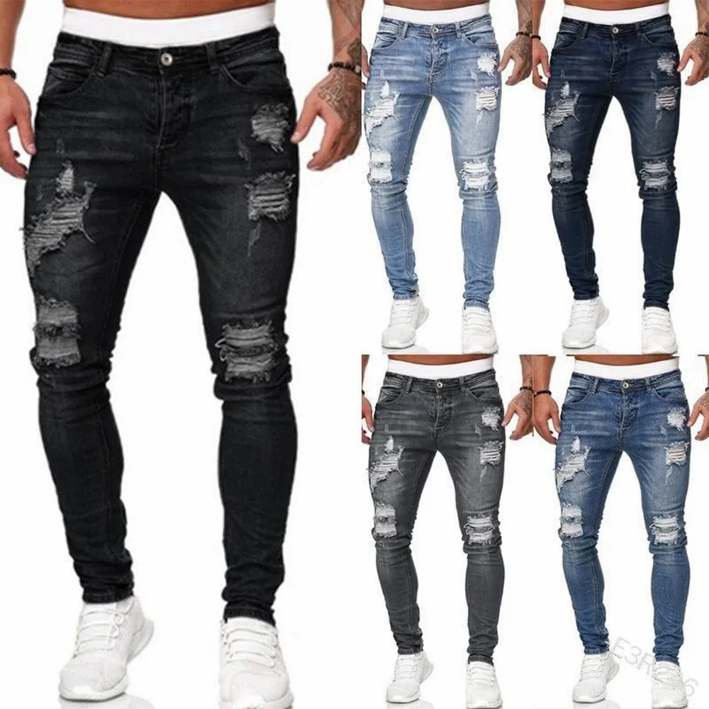 Distressed Streetwear Ripped Skinny Jeans Men Vintage Wash Solid Elastic Biker H