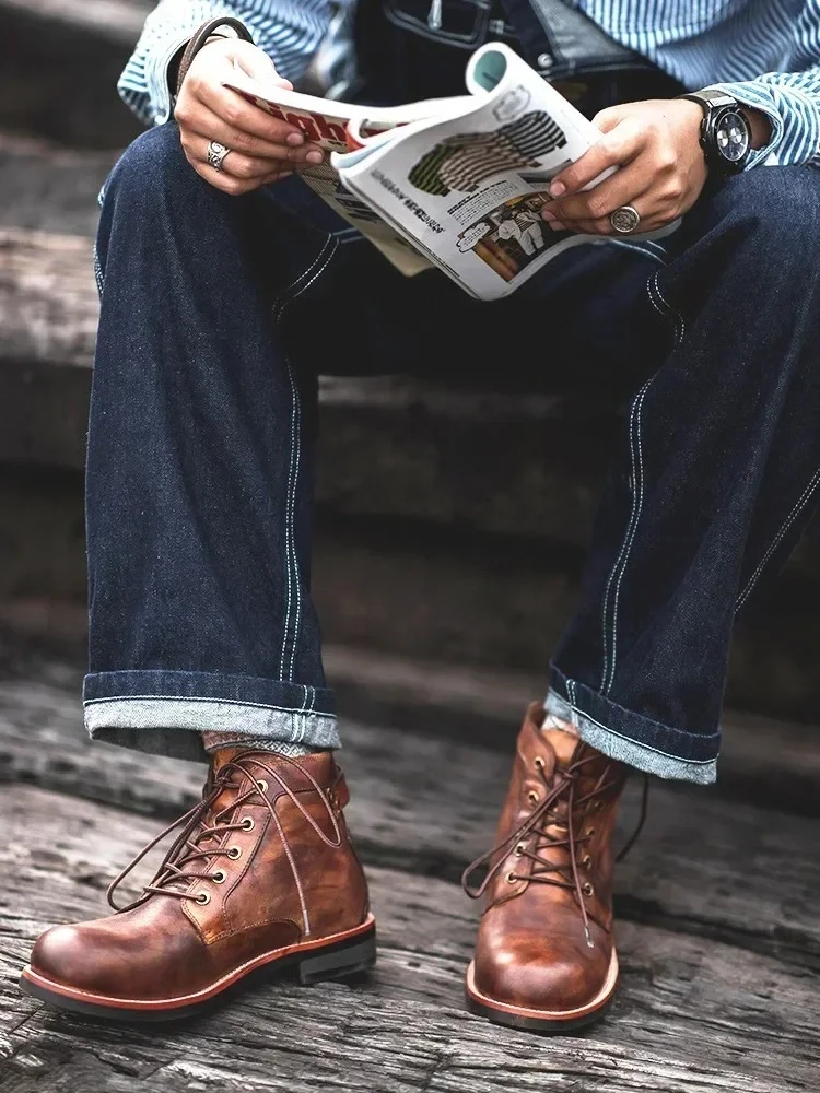 Handmade Leather Men Boots Retro Round Toe Ankle Boots Autumn Winter Punk Stree