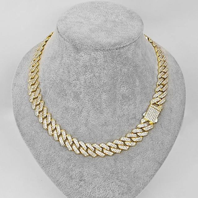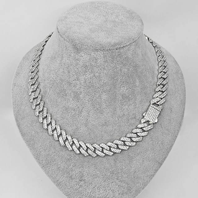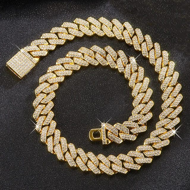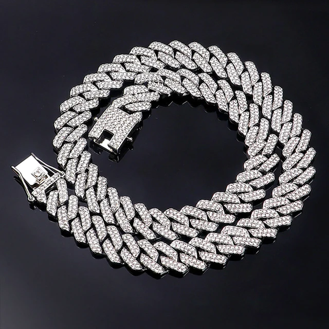Hip Hop Shiny 15MM Cuban Link Chain Necklace Women Men Silver Color Rhinestone I
