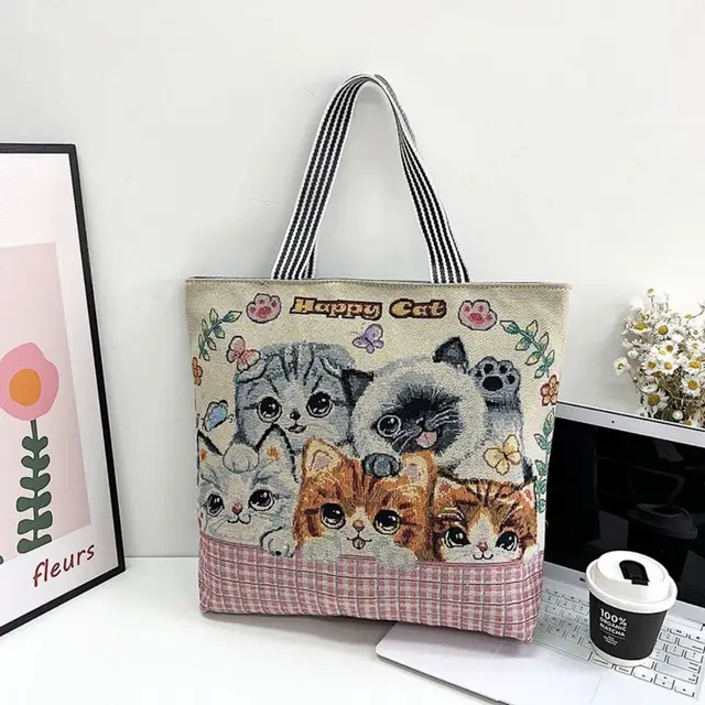 Large Capacity Cloth Pouch Ethnic Style Handbag Vintage Cute Cat Embroidery Anim