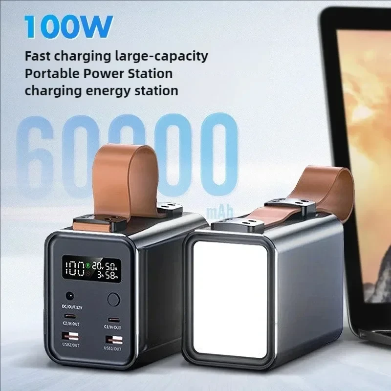 Compact & Portable Design:At just 1.2kg with a sleek 116*72*94mm size, this power bank is designed for on-the-go convenience. Power Bank 100w|Power Bank 100w Fast Charging|High Capacity Power Bank:Equipped with a massive 60000mAh capacity, this power bank ensures long-lasting power for your devices. USB C Fast Charging Technology:Features USB C fast charging, allowing for quick power-ups of your iPhone 15 or Samsung devices. Digital Display & LED Lamp:Boasts a digital display and LED lamp for easy monitoring of power levels and lighting in low-light situations. Multi-Port Output:With dual USB and DC outputs, this power bank provides versatile charging options for various devices