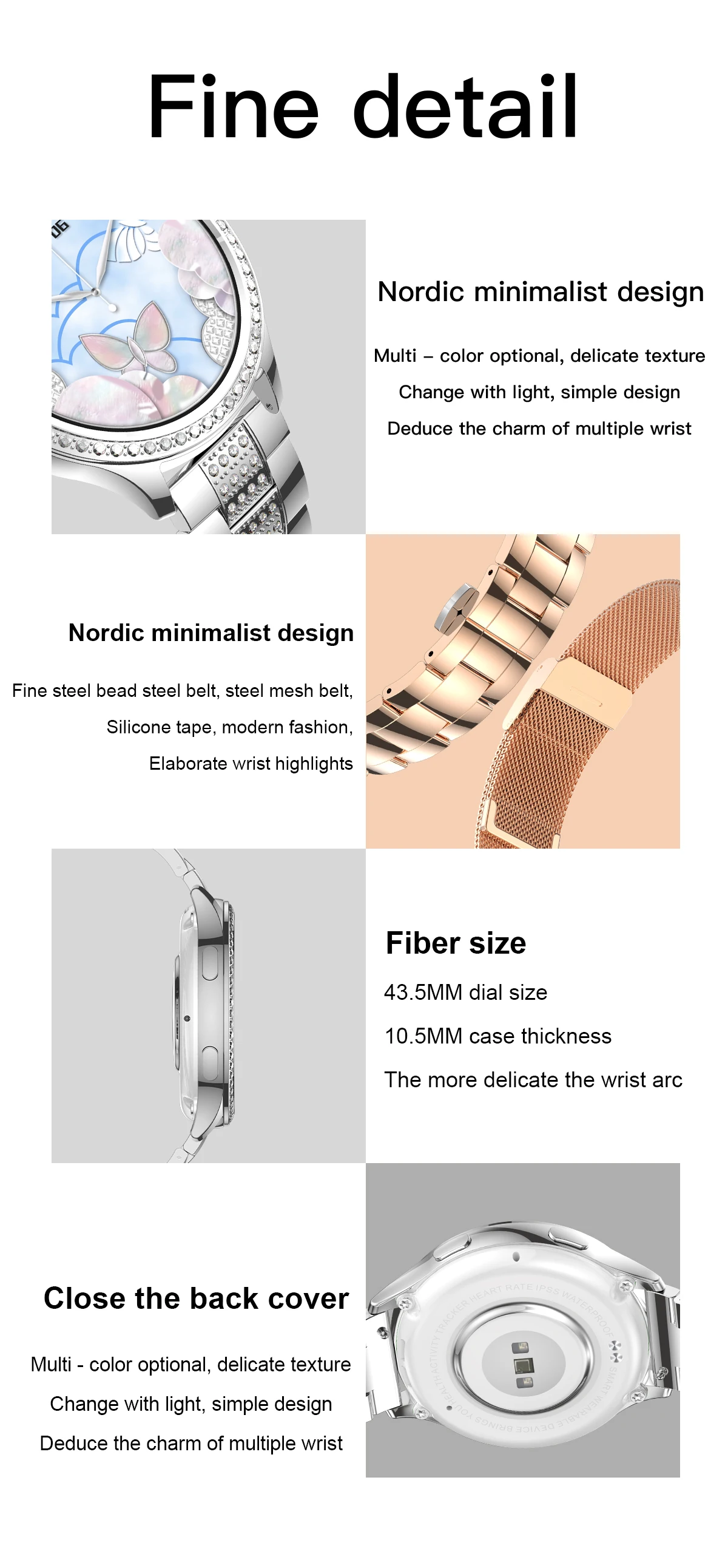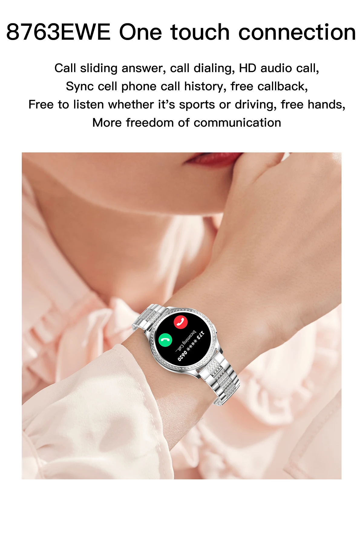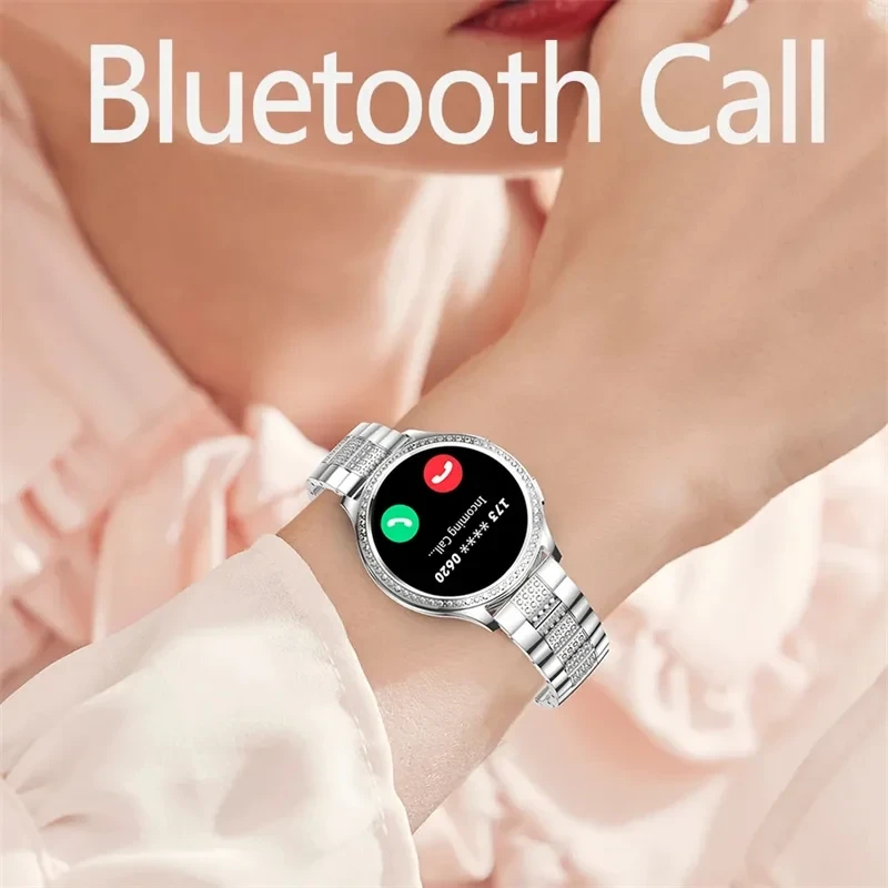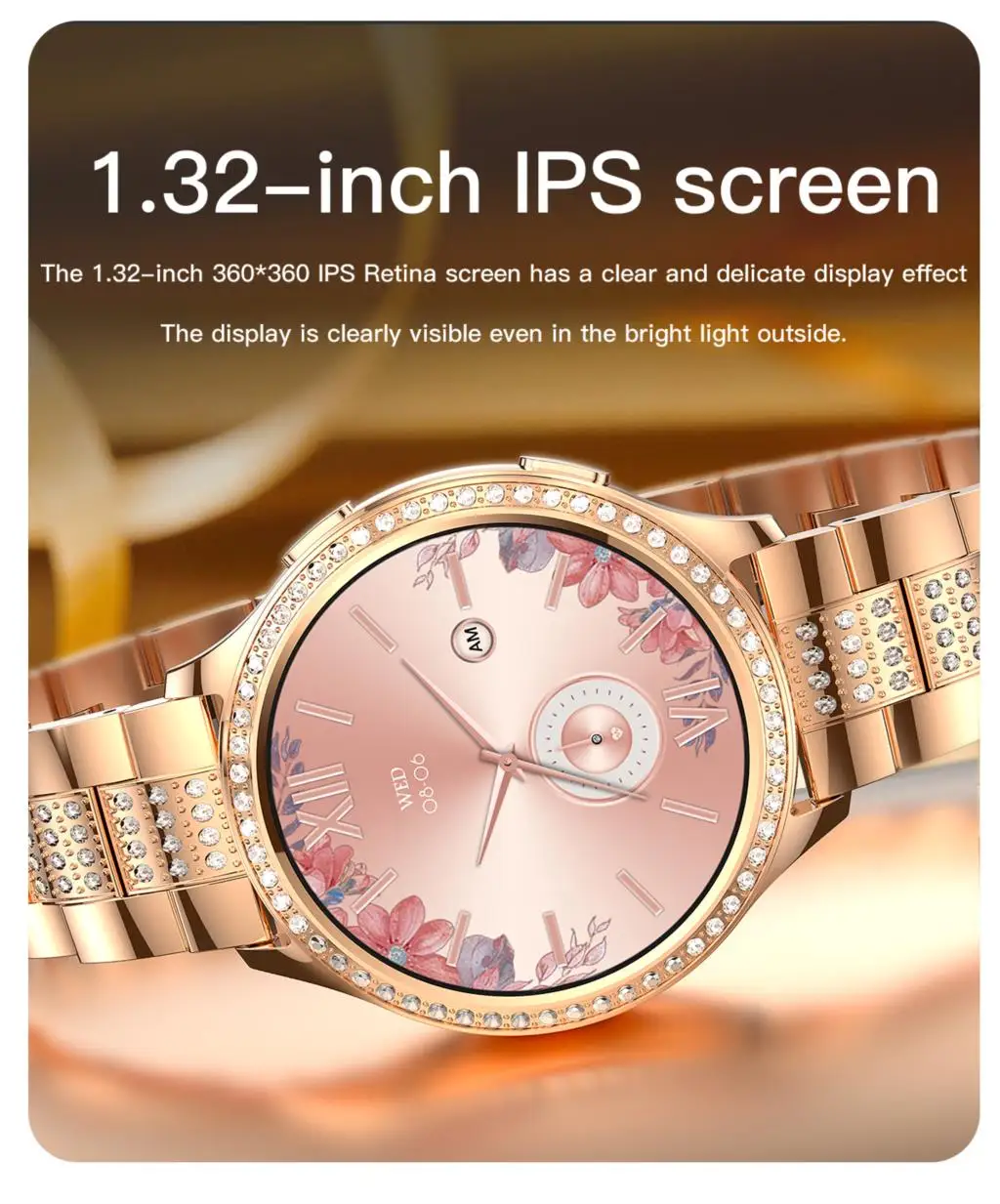 Diamond case, 1.32" 360*360 HD full touch screen, female physiological health, one-touch connection, red light 24-hour true blood oxygen, heart rate, message push, pedometer, music player, Bluetooth call, call log, contact, phone dial, sedentary reminder (APP), sleep monitoring, remote photo, weather forecast, voice assistant, 100+ sports modes, health monitoring, custom Dial, IP67 waterproof