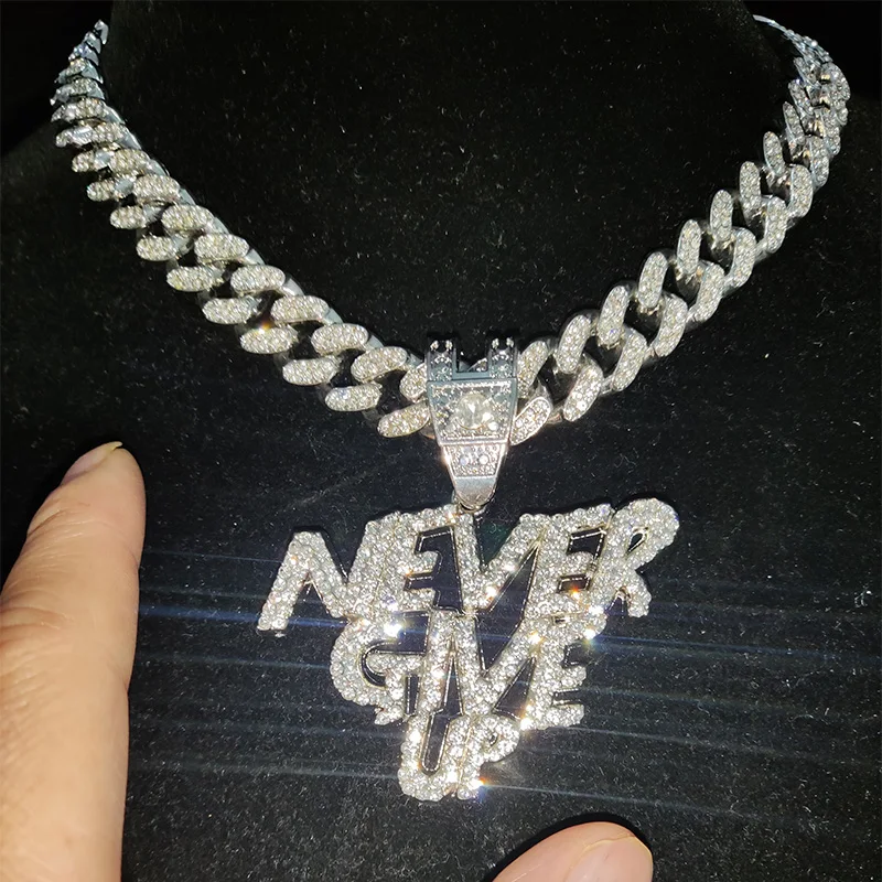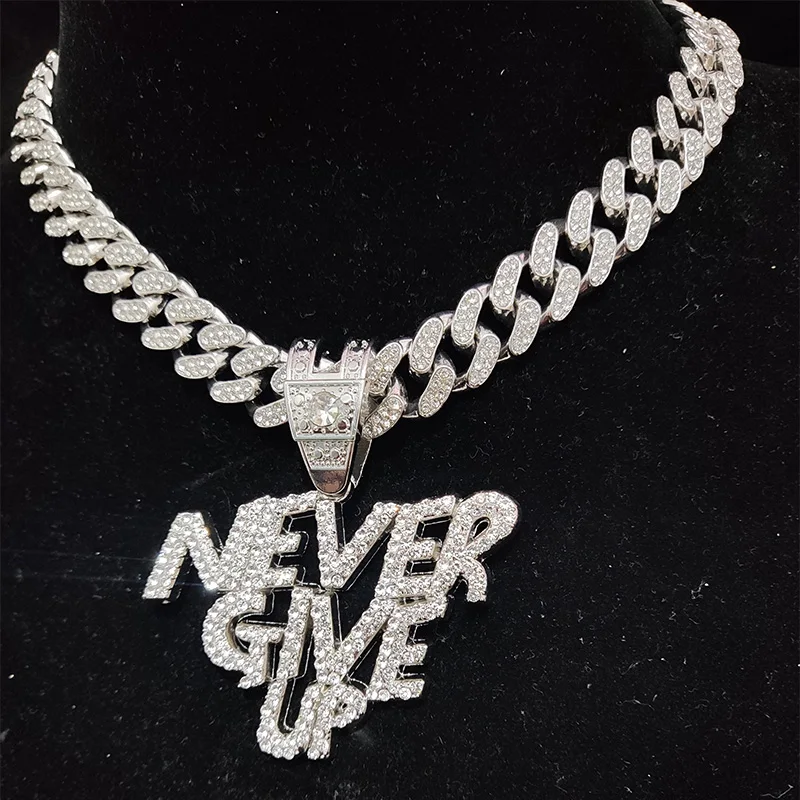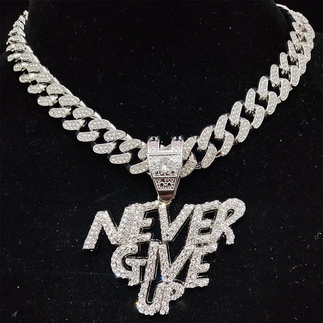 Men Women Hip Hop NEVER GIVE UP Pendant Necklace 13mm Crystal Cuban Chain HipHop