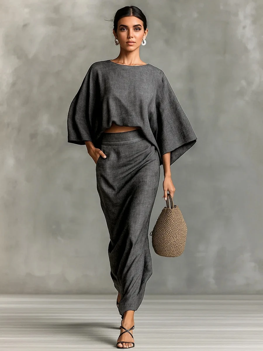 Material Composition: Synthetic fiber Clothing Patterns: Loose Sleeve Length(cm): Three Quarter Season: Autumn/Winter Dresses Length: Ankle-length Closure Type: Pullover |Skirt And Top Outfit| **Effortless Elegance for the Modern Woman** Step into the new season with our 2025 New Fashion Bat Sleeve Shirt + Skirt Suit, a harmonious blend of comfort and style designed for the modern woman. With a loose, casual silhouette and a solid color palette, this ensemble offers a timeless look that transcends trends. The fabric composition of 71%-80% polyester ensures durability and ease of care, making it a practical choice for the busy woman on the go. **Versatile Fashion for Every Occasion** This skirt and top suit is not just a fashion statement but a versatile addition to your wardrobe. The pullover design with a comfortable elastic waist ensures a relaxed fit, perfect for a casual day out or a laid-back office environment. The ankle-length skirt provides a graceful finish, while the three-quarter sleeves offer a balance between warmth and style. Whether you're running errands, meeting friends, or enjoying a cozy evening at home, this outfit adapts to every scenario with ease. **Tailored for the Modern Woman** Our skirt top suit is tailored to cater to the needs of the