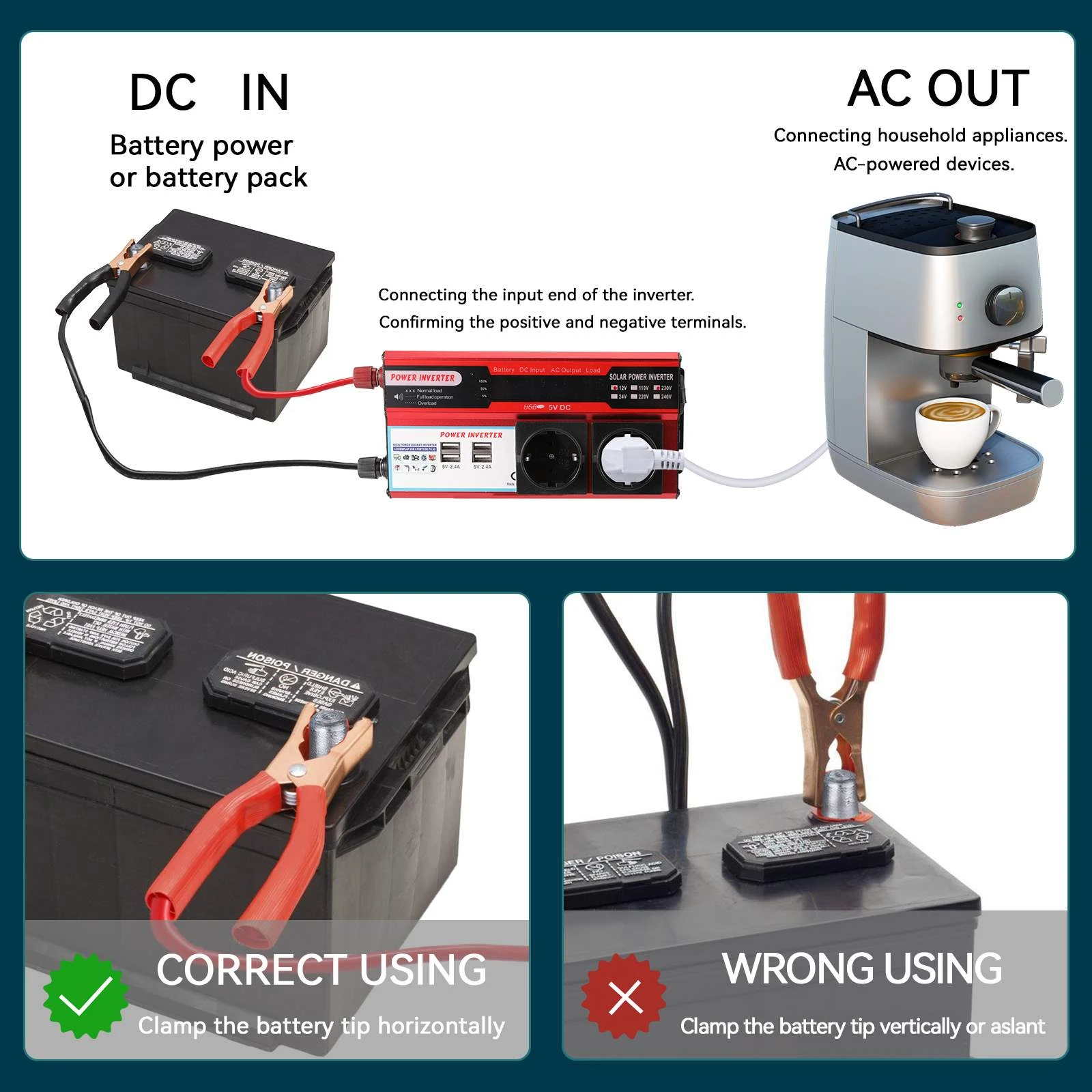 High power conversion efficiency: The inverter's conversion efficiency is 0.8, indicating it can efficiently convert direct current into alternating current. Multiple USB ports: With four USB ports, you can charge multiple devices simultaneously, making it perfect for road travel and camping. LED display screen: The LED display screen displays the input and output voltage, making it convenient to monitor the device's battery usage and charging status. Wide input voltage range: The inverter can accept DC power from 12V to 15V, making it compatible with various devices.