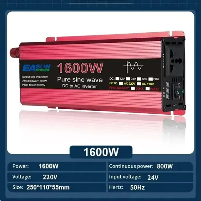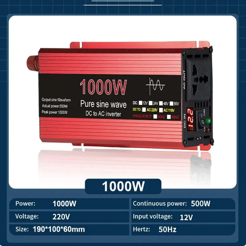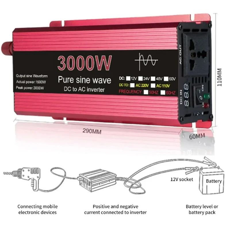 Output Waveform : Pure sine wave inverter Peak power :1000W/1600W/2200W/3000w Continues Output Power :500W/800W/1100W/1500W/ Frequency : 50HZ±2HZ No load current draw : 0.9Amps Inversion Efficiency : >90% lnput DC voltage : 12V/24V can be choose Output AC Voltage : 110V±10%/220V±10% Output frequency:50Hz/60Hz Low Voltage Alarm : 10V DC士 0.5V Low voltage Shut Down : 9V DC±0.5V Over Load : Shut Off output Over Thermal : Shut Off Output Automatically Fuses : Short Circuit Start : Soft Start Protection : Overload, Short Circuit,overtemp, Reverse Polarity, Under/Over USB Output : None No load current: Material:Aluminum Alloy Socket Style : Universal Socket Specifications: Safety Protection Function: ①Reverse polarity protection ②Low input voltage protection ③High input voltage protection ④over-current protection ⑤Short circuit protection ⑥Over temperature protection ⑦Overload protection ⑧Internal fuses Package Included: Package include : 1 * Inverter 1 * Crocodile clip Notes: 1.Please ensure thatthe rated power is higher than the appliance you want to apply. 2.Please do not connect the inverter with the grid power, and a reverse connection of positive and neg-ative is also forbidden |