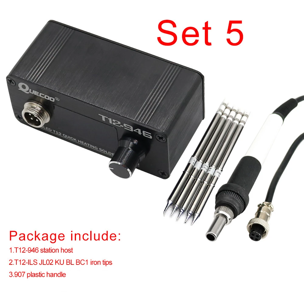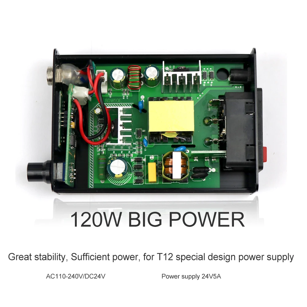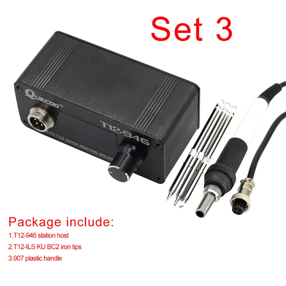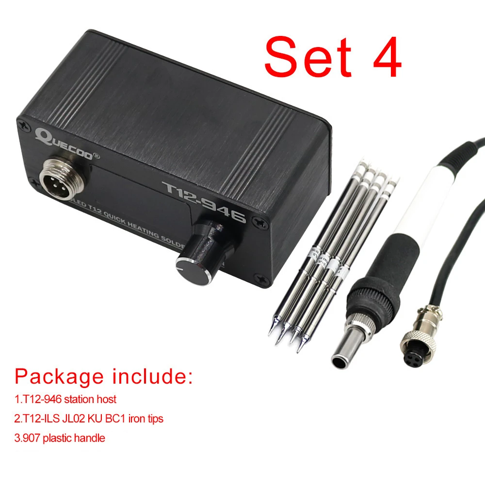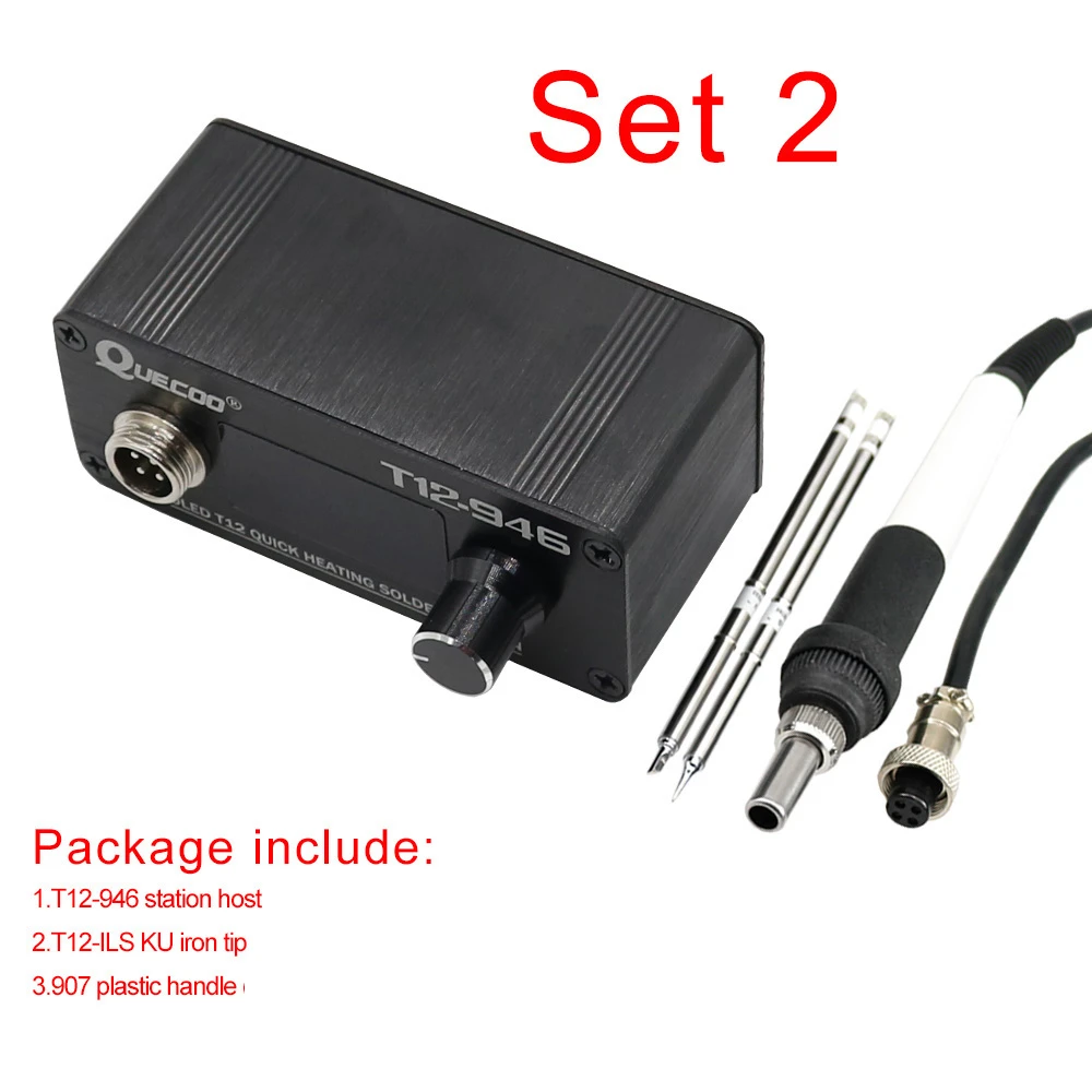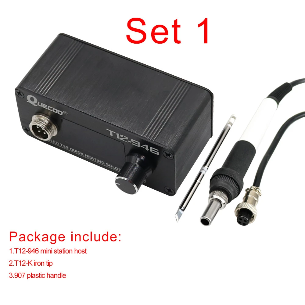 Quick Heating STC T12-946 Mini soldering station electronic 1.3-inch Digital controller with 907 plastic handle welding iron tips NOTE: THIS IS T12-946 MINI Portable OLED T12 solder iron station, doesn't include power supply, You need to buy a DC 24V 4A power supply in addition. Please use a 3-5A power supply to drive this soldering station also. If you want change the default Tip , please tell us or leave a message. The iron tip does not work continuously at high temperatures; high temperatures can easily damage the tip! Ordinary solder melting point is 183 degrees, lead-free solder melting point is 227 degrees, usually the welding temperature is 300-380degC, 380 degrees is the temperature of the dividing line, higher than 380 degrees, iron head oxidation and loss is extremely fast, seriously affect the heating core life The Higher than 380 degrees temperature display will be beating, the higher the temperature, the greater the beating! Recommended in the 300-380 degrees for welding work, most of the work can be carried out, the temperature beating is normal, and it does not affect the use! If you can use low temperature, then do not use high temperature: T12 is constant temperature control, the general recommended working temperature control is between 300 ℃ ~ 380 ℃, higher than 380 ℃ damages the coating ofthe solder tip and cut down the PTC life! ![]() ![]() ![]() ![]() ![]() ![]() ![]() ![]() ![]() ![]() ![]()