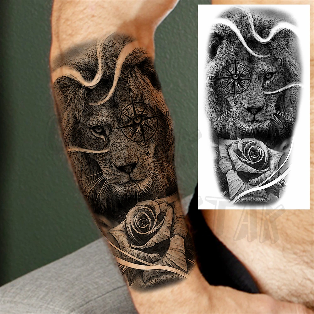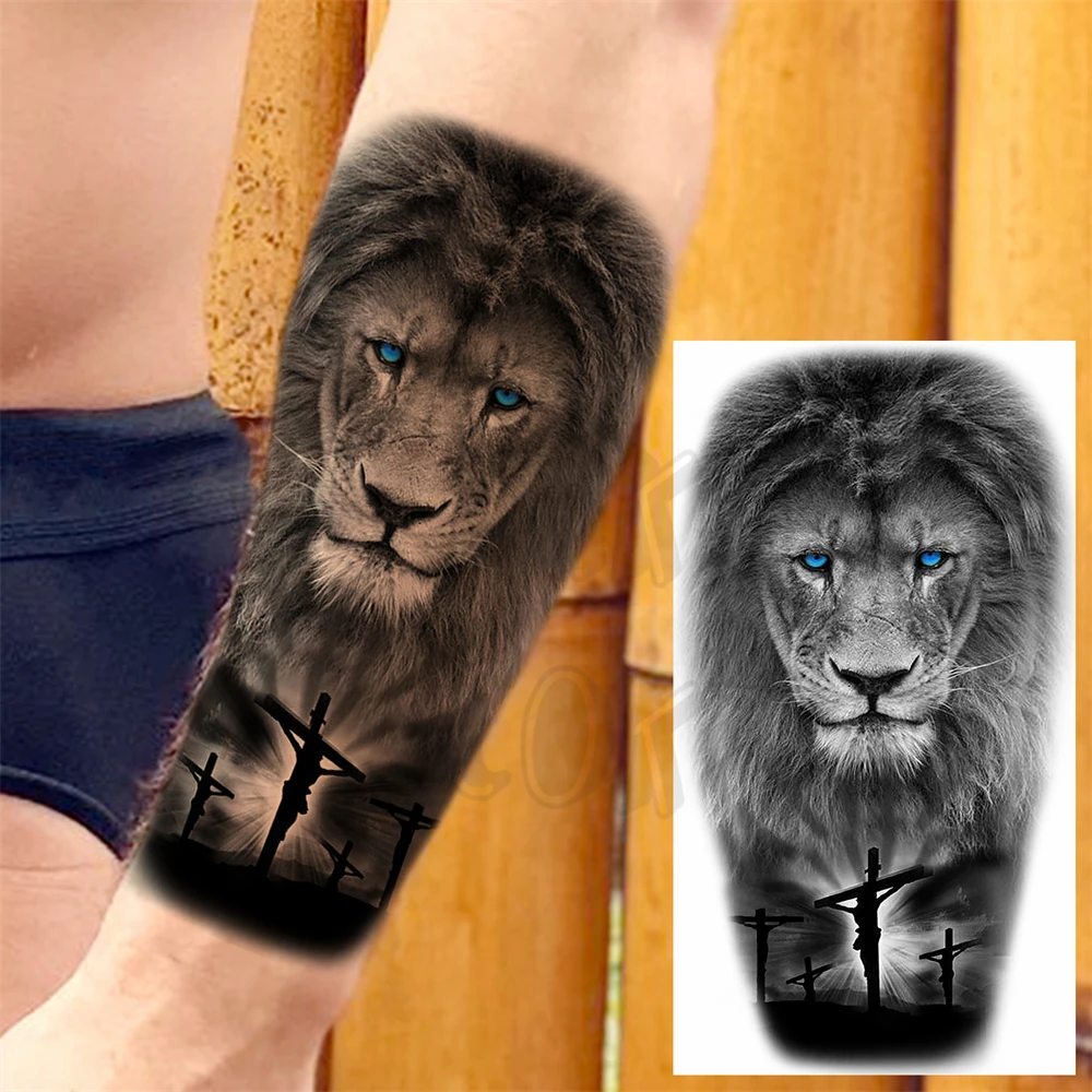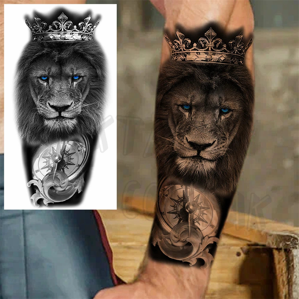 Realistic Lion Eyes Arm Temporary Tattoos For Women Adult Men Lion Compass Crown