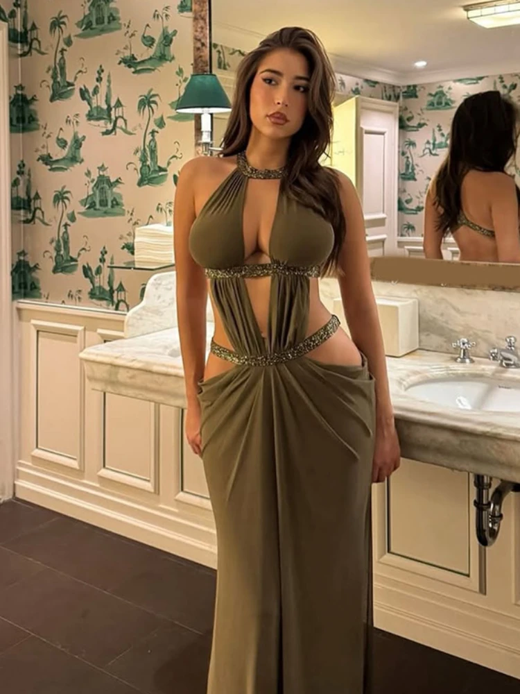 Hollow Out Design The hollow out halter design adds a touch of elegance and sexiness to this maxi dress, perfect for party-goers seeking a standout look. Slim Silhouette The slim silhouette of this dress accentuates your figure, making it a flattering choice for any body type. Sleeveless Comfort Enjoy the freedom of movement with the sleeveless design, ideal for warmer weather or for those who prefer a more relaxed fit. High-Quality Material Crafted from high-quality polyester, this dress offers durability and comfort, ensuring you look great while feeling great. Versatile Occasion Wear Whether it's a formal event or a casual gathering, this versatile dress is suitable for all seasons and occasions.
