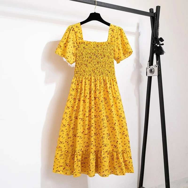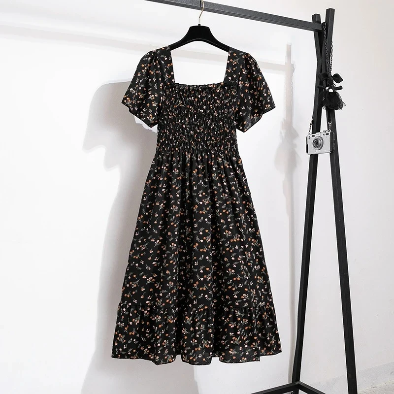 Spring Summer Chiffon Dress Women Midi Dresses Female Short Sleeve Elastic Waist Printed Floral Pleated Backless Casual Dress