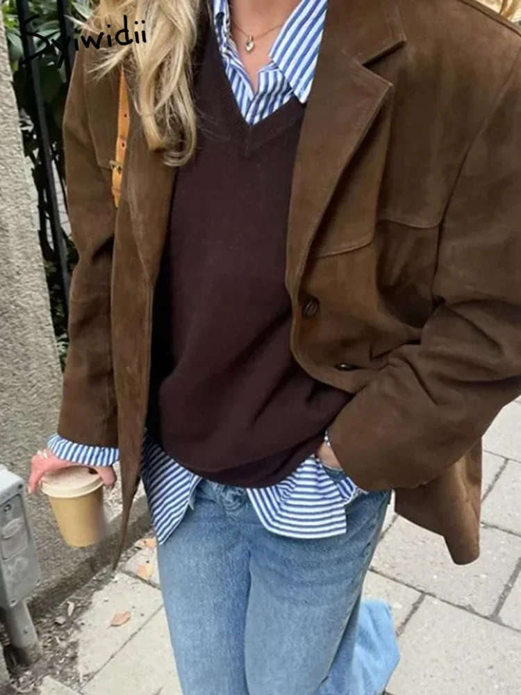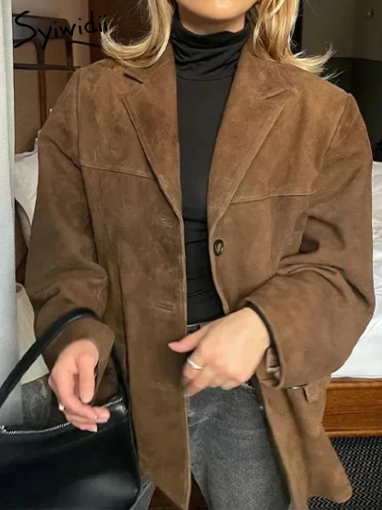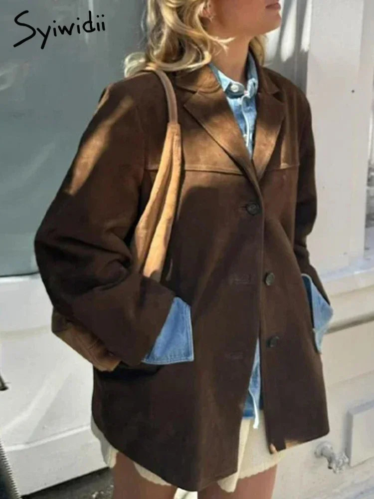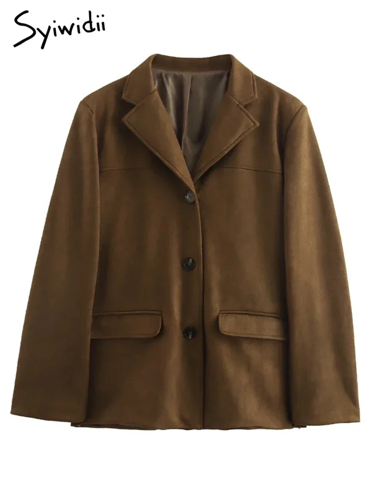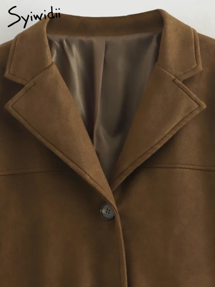 Syiwidii Brown Women Suede Jacket High Street Fashion Lapel with Pocket CasualLa