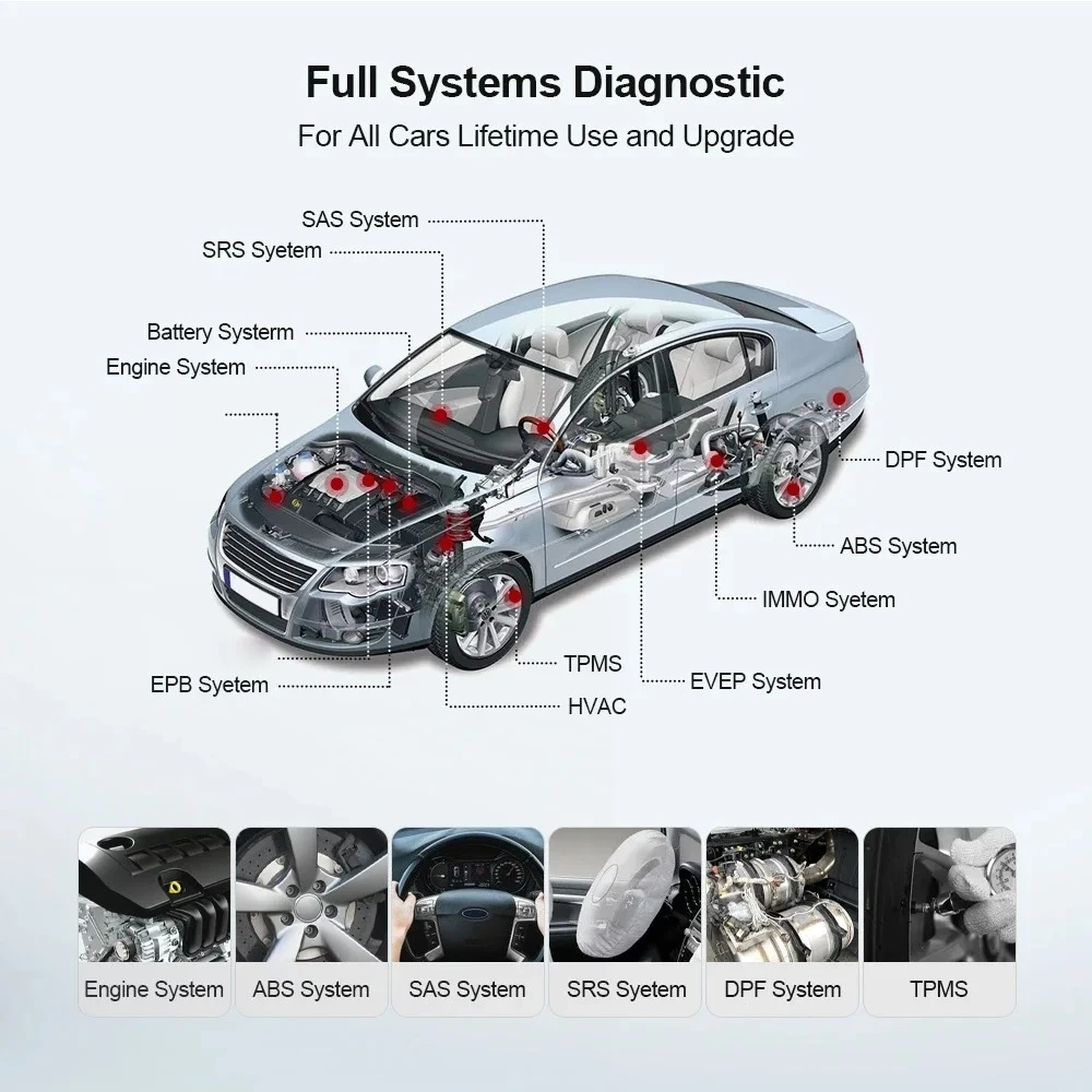 All Cars Lifetime Free Full System Diagnostic The Diagnostics application enables a data link to the electronic control system of the test vehicle for vehicle diagnosis. The application performs functional tests, retrieves vehicle diagnostic information such as trouble and event codes and live data for various vehicle control systems, such as ABS, SRS, Engine, Transmission, Brake System, Emission System, Fuel system, Light system, Wiper System etc. ECM = Engine System IC = Instrument System ABS System = Antilock Brake System SRS System = Air Bag Restraint System TCM = Transmission System BCM = Chassis System EPS = Electric Power Steering System EPB System = Electric Park Brake System TPMS System = Tire Pressure Monitoring System AC System = Air Conditioning System Security System IMMO System ETC. Lifetime free All 10 Mode OBDII/EOBD Functions: Supported models: compatible with all models supporting OBD II protocol after 1996 support protocol:ISO 14230-4(KWP2000)/IOS 15765-4(CAN)/ISO 9141-2(IOS)/ISO14229(UDS)/SAEJ 1850(VPW&PWM)" Mode 1:Read live data stream Mode 2:Read freeze frame data Mode 3:Read DTCs(diagnostic trouble codes) Mode 4:Clear dtcs Mode 5:Oxygen sensor monitoring Mode 6:System monitoring Mode 7:Read pending DTCs Mode 8:Control operation of on-board system Mode 9:Read vehicle information Mode 10:Request emissions-related diagnostic trouble codes with permanent status after a clear/reset emission-related diagnostic information.