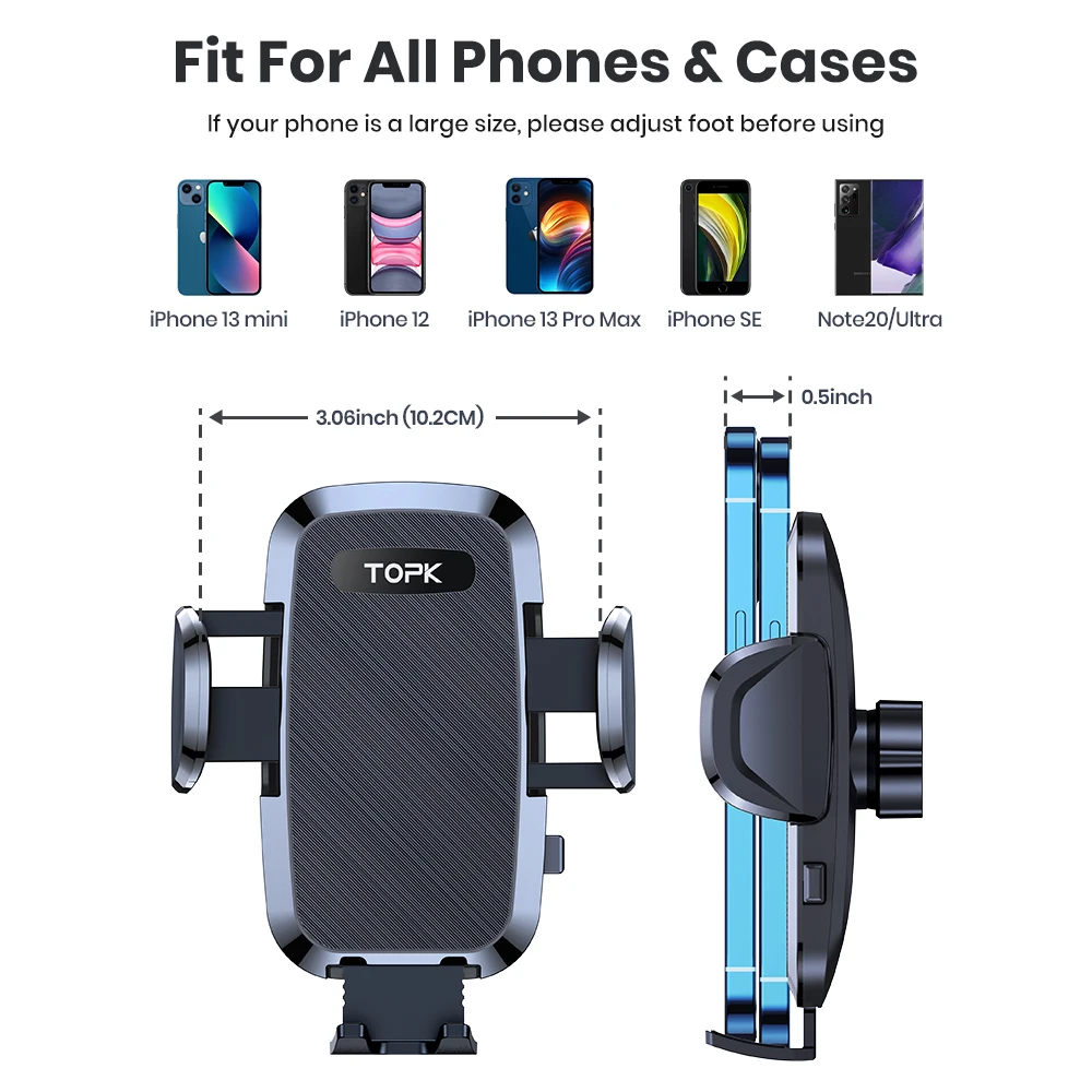 About this item [Safe and Stable] This car phone holder with the latest hook clip design, can be securely attached to the air vents. And holds your phone tightly even on turning, roads with potholes, speed bumps and bumpy roads.Don't need to worry about your phone falling off when driving. [One Hand Operation] Press the release button on the back side to open the clamp arms, place your phone and squeeze the clamp arms to lock, easy to insert and remove your phone with a single hand while the holder provides a firm grip on your phone. Providing with safer driving whether you are navigating, playing music, or charging. [Freely 360° Rotation] TOPK air vent phone car holder features a 360° ball joint that assists in adjusting the viewing angle for a clear screen view, in either landscape or portrait mode.We have also designed a non-slip fingerprint area on the side clamps so that you can hold your phone more easily with one hand. [All-round Protection] Built-in gear upgraded, the car phone holder support plate and feet have non-slip silicone pads, especially the arms with notched soft silicone, which not only increase the grip of the phone, ensure safe driving, but also effectively greatly protect your phone from bumps and scratches. And the phone won't fall even on rough roads. [Wide Compatibility] TOPK phone holder is compatible with all 4.0-6.7 inches devices, including iPhone, Samsung, Xiaomi, OnePlus, HUAWEI etc.NOTE: Holder can't compatible the phone case which is too thick or rough, like Leather Flip Wallet Cover, Cover for A Quad Lock, Heavy Duty Case, etc. If the product arrives doesn't fit the car or any product issues,please directly contact TOPK for a satisfied solution.