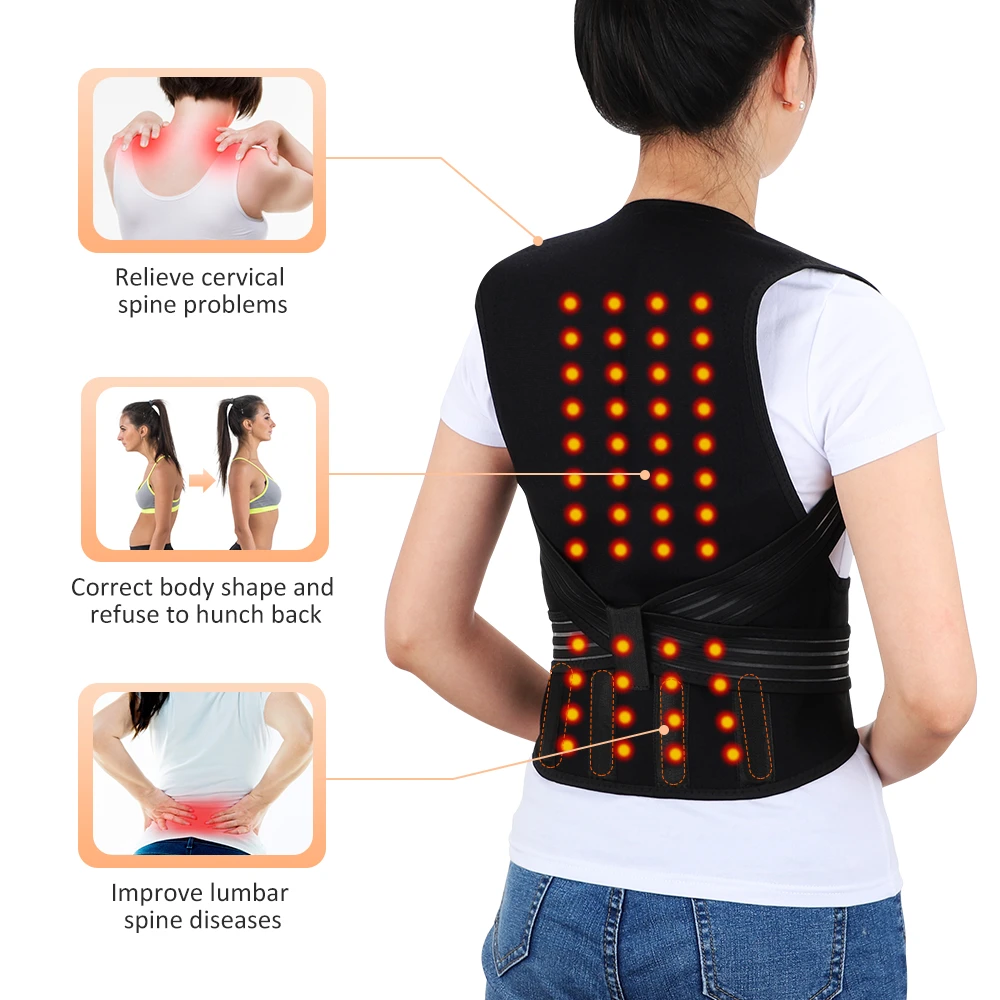 Product B: 118 Magnets Tourmaline Waist Belt Back Posture Corrector (with 7 ABS Plate Support) Features: 1. Built-in 118 energy magnets, self-heating acupoint magnet therapy, accurately correspond to the shoulder and back acupuncture points, effectively relieve the cold and soreness of the shoulder and neck. 2. A large area of the back is heated, and the effect of hot compress is doubled, relieves frozen shoulder and lower back discomfort, and protects the health of your shoulders and lumbar spine. 3. Effectively improve shoulder and waist discomfort, correct posture, improve sloping shoulders, and shape a beautiful body. 4. 7 detachable ABS support bars and two-way elastic fixing straps perfectly fit the shoulders and back, disperse the pressure on the lumbar spine, and make the wearing more stable. 5. Do not wear clothes when using this product; it must be used on the skin. 6. The warm-up time is about 40 minutes, and the temperature is higher than the normal body temperature.