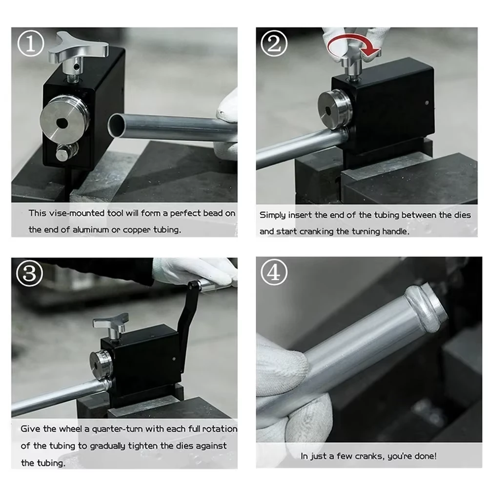 If you receive a package and find that the top mounting screw is missing, it's because it went inside. Press the circular drum next to it and it will come out Feature: 1. Designed to be mounted in your vise whether mounted on a bench, wall, or floor.( Works best when secured in a vice.) 2. By turning the handle on the side of the tubing crimping tool, you can form the desired crimp on the end of the aluminum tubing or copper tubing. The detachable handle is specially designed for the user, allowing you to operate it more easily. 3. Form a perfect bead on tubes so that rubber or silicone hose can be more securely clamped to them. 4. Simply insert the end of the tubing between the dies and start cranking the turning handle. Give the wheel a quarter-turn with each full rotation of the tubing to gradually tighten the dies against the tubing. (Note: Always apply the bead before welding.) Application: For Aluminum, Steel, Copper Intercooler Pipe. For Wall Thickness of Aluminium Tube shouldn't be greater than 0.050"(1.25mm).