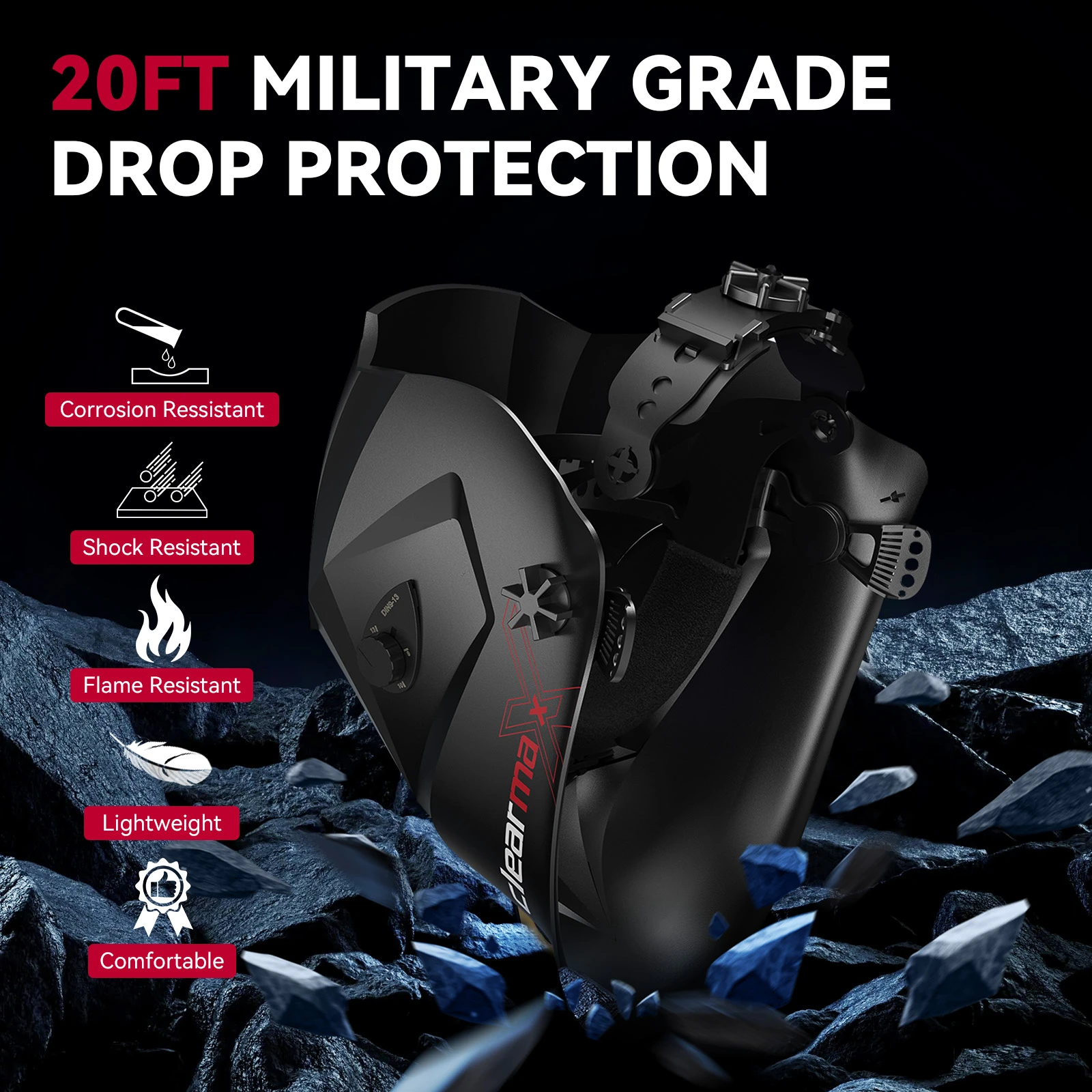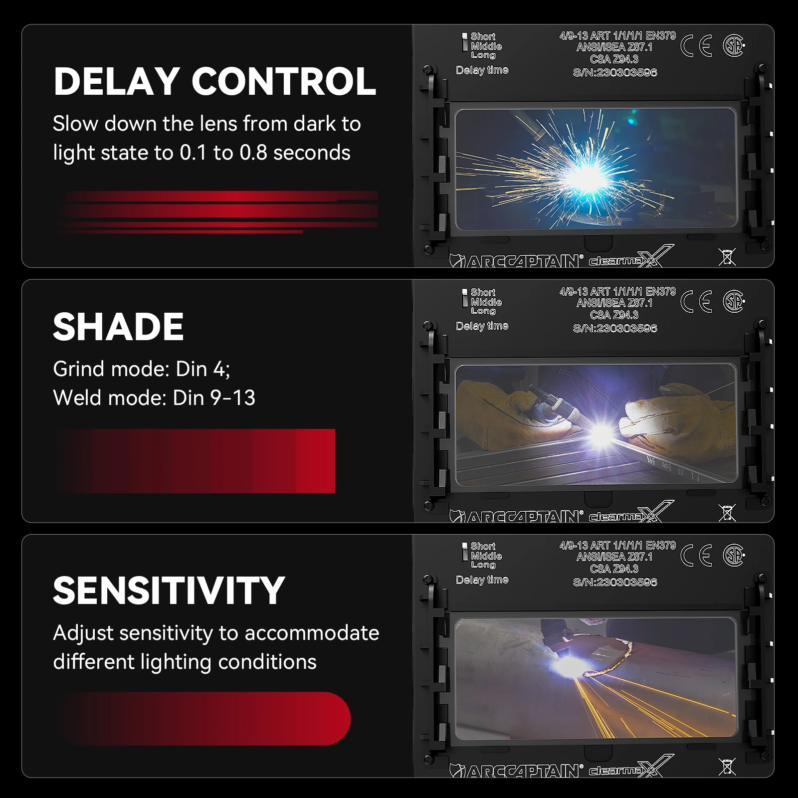 Features: 1.【SUPERIOR CLARITY】The welding helmet features top 1/1/1/1 optical clarity lens with advanced true-color technology and large viewing screen 3.86”×1.69”, it will vastly improve your vision experience then you can work efficiently and with precision. 2.【AUTO DARKENING FILTER】Helmet comes with high-end auto-darkening lens with 4 arc sensors, that switches from light to dark in 1/25000 sec, which let you adapt to different working environments by adjusting the lens's shade and sensitivity while you are operating ARC/MIG/TIG Welding. 3.【OPTIMAL EYE PROTECTION】The welding hood achieves safety and efficiency with its smart filters that protect your eyes from intense welding glare. Fully automatic up to DIN 16 at all time UV/IR protection, it reduces the risk of exposure to harmful light generated by the welding process and allows greater adaptability to various environment. 4.【SUPERIOR COMFORT】ARCCAPTAIN welding helmet is well made and come in at only 1 pounds, which is 60% lighter than similar products, which can reduce the load on the cervical spine obviously during working, so it remains comfortable even for extended use. The dynamically adjustable headgear with breathable padding to provide you with the perfect fit , comfort and adaptability that you might need. 5.【LONG-LASTING DURABILITY】The auto darkening welding mask was made of high-impact resistant material PA, it features shock resistant and flame Resistant. The helmet meet ANSI Z87.1/ EN379 CE/ CSA Z94.3 compliant. Power by solar cell and CR2450 replacement lithium battery supports long-lasting working time and is quite eco-friendly. Easy to Adjust while Weld Working External Sensitivity and Shade button can be adjusted without taking off the helmet while welding,then you can work efficiently and with precision. External Weld/Grind button allows you to quickly switch between weld and grind modes without having to remove the helmet or your gloves. Designed for comfort, headgear is built with three-position slider to adjust distance from eye to lens; Locks into a detent when lifted and maintainsupward position until manually lowered. The width, depth and angle of the headgear can be adjusted, please follow your own head to adjust to the appropriate range. Specifications: Brand:ARCCAPTAIN Size:One size and Adjustable Style:HSH-S800 League:MMA
