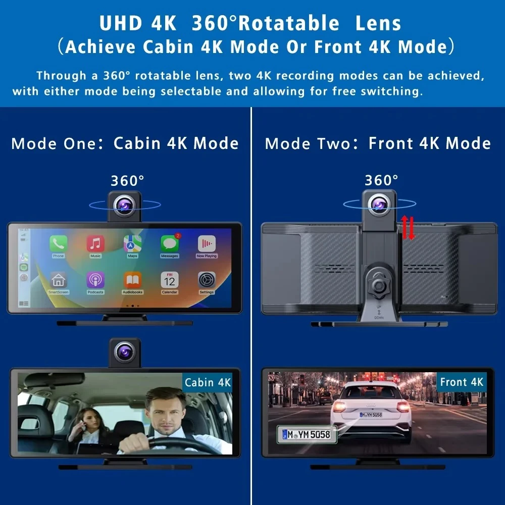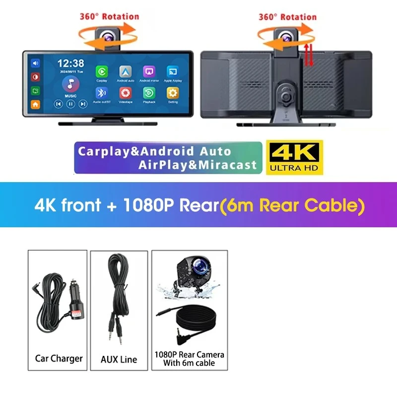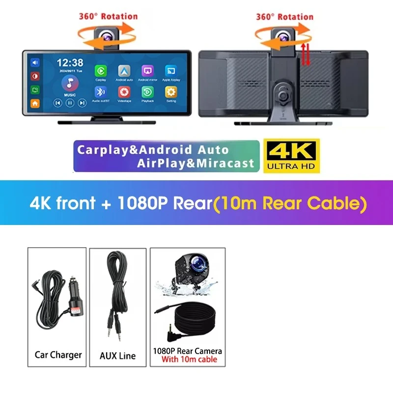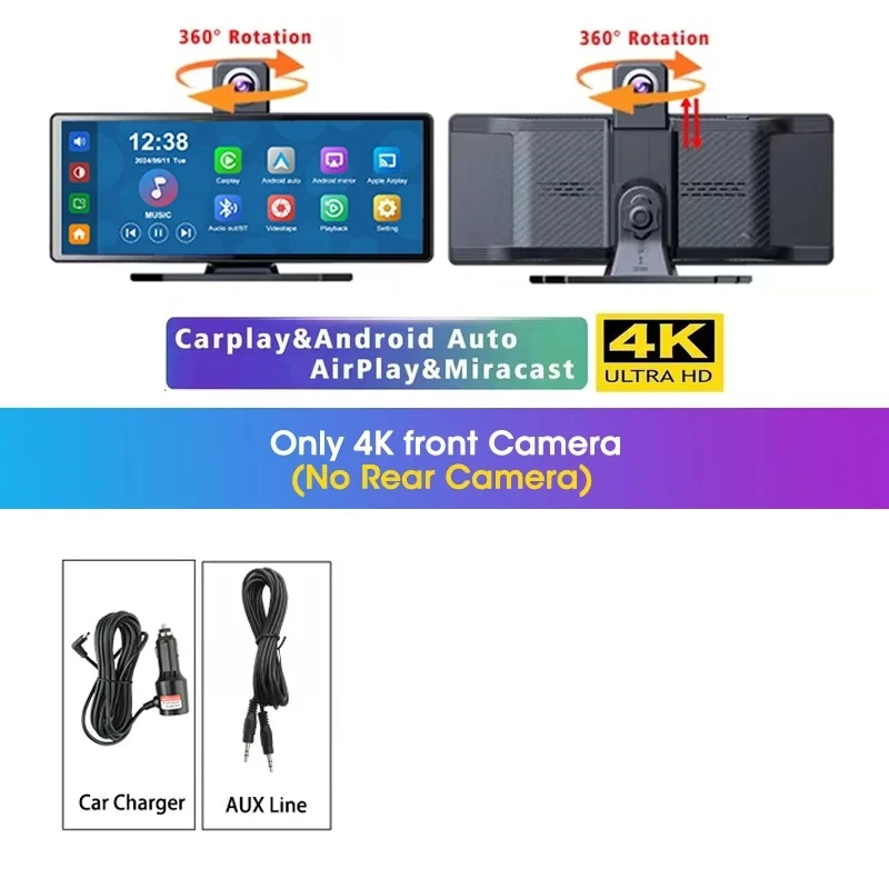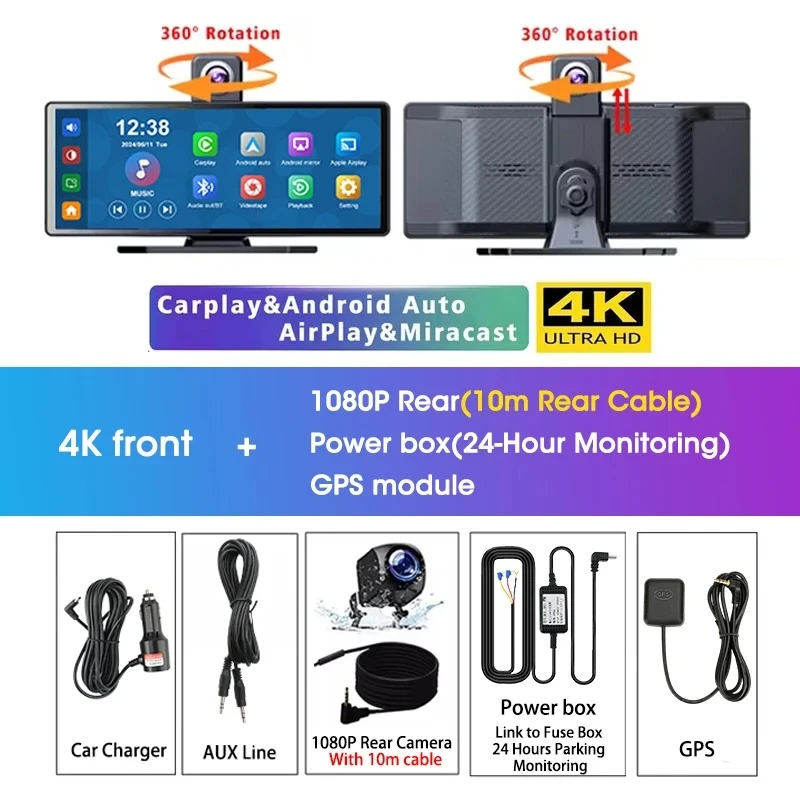 Supports Four Screen Projection Modes: For Iphone: Carplay/AirPlay For Android Phone:Android Auto/Miracast Front Or Cabin: UHD 4K 3840*2160P; Back:AHD 1080P Language Support: English, Chinese, Korean, Japanese, Portuguese, Polish, Spanish, Arabic, French, German, Italian, Hebrew, Russian, Turkish, Czech, Dutch,Vietnamese,Malay. Memory Card Support: 32G/64G/128G/256G Due to the fact that DVR is a 4K high-definition recording high-speed storage, please make sure to use high-quality U3 grade C10 high-speed brand memory cards. Some ordinary and inexpensive memory cards may not function properly. When installing a memory card for the first time, be sure to format the memory card on the DVR. After formatting, the DVR can correctly match the memory card. Formatting Steps: After installing the memory card, please enter the DVR menu, find the format option, and click to format the memory card(Important: Formatting the memory card on the computer is an incorrect operation. Please be sure to format the memory card on the DVR's menu option.) About The Connection Of Carplay And Android Auto:(1) If it is an Apple phone, the DVR needs to choose the Carplay connection method as the connection method, and the Carplay software installed on the Apple phone can directly connect to the DVR through the Carplay function;(2) If it is an Android system phone, the DVR needs to select Android Auto as the connection method, and then use the Android Auto software downloaded from the Google App Market on the phone to connect to the DVR. About WIFI Connection: Before connecting to the DVR on the phone, it is necessary to install the WIFI connection app "Viidure" in advance.You can search for "Viidure" installation in the Apple App Store or Google App Market. Steps: (3)Open the "Viidure" APP on your phone, enter the configuration mode, turn on the wifi function of the phone, follow the prompts to find the SSID wifi signal of the DVR and enter the password to connect; About The Reversing Assist Function: If the kit you ordered includes a rearview camera and you need to implement the reversing assist function, you need to connect the red signal wire of the rearview camera to the car's reversing light (the light will come on when reversing). If you don't need the reverse assist function, just disconnect the red signal wire and leave it unconnected. About 24-Hour Parking Monitoring: About The Installation And Use Of GPS(Optional): 1. Connect the GPS module to the DVR and turn on the GPS function in the DVR menu settings; 2. Install the DVR on the car and start the recording mode. Start the car outdoors and drive for a certain distance. The GPS module will automatically capture the satellite signal and the DVR will automatically record the video with the GPS driving track. 1. Install the GPS dedicated video player "Hit GPS Player" on your computer. Please enter the link below in your computer browser to download and install; Download link: https://pcgps.ce2ce.com/hit/hitplayer.html