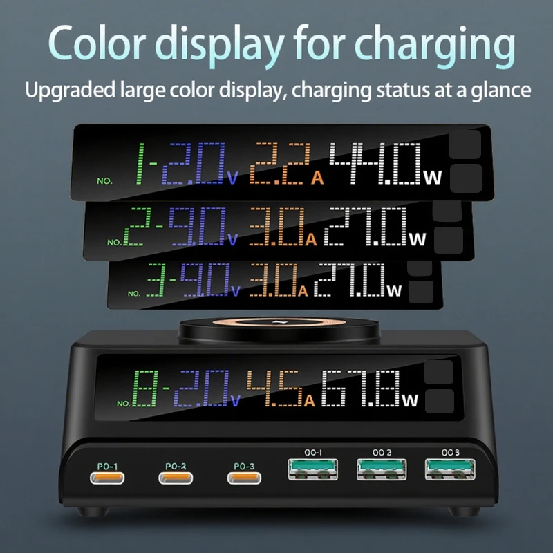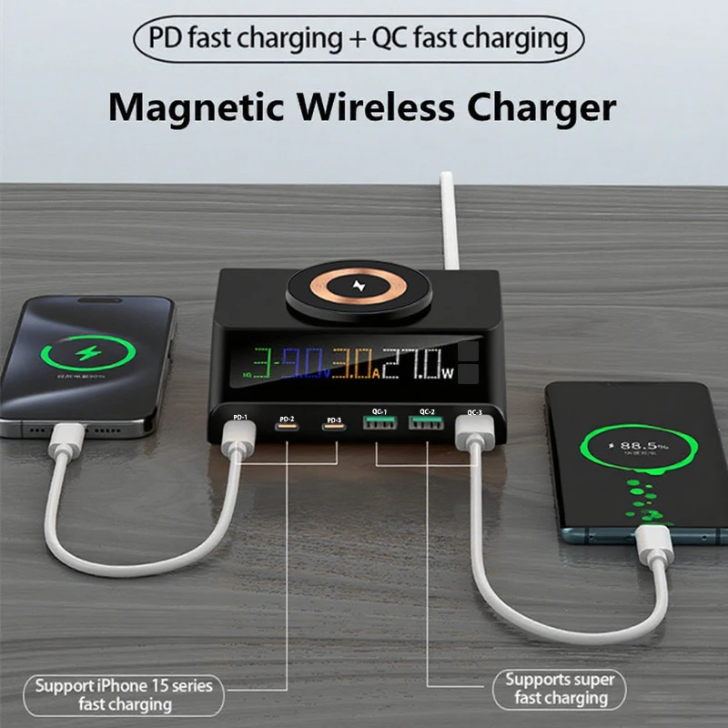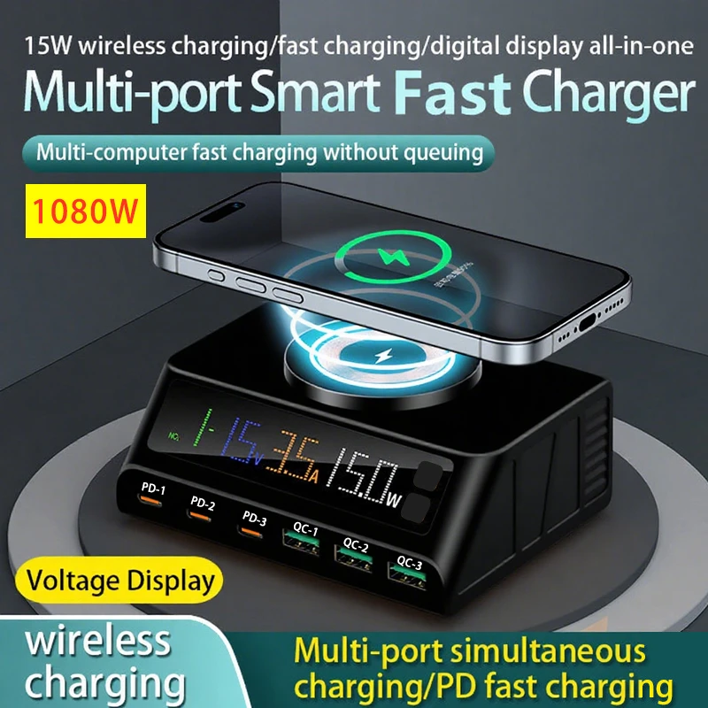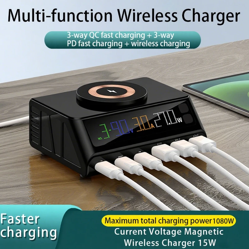 All in one 1080W 6 PORTS With Magnetic Wireless Charging for All Phones/Tablet/Laptop,and others devices. • 1080W Max Output Power :Charge your devices quickly with a maximum output power of 1080W. • Upgraded to Magnetic Wireless Charging :Say goodbye to tangled cords and wires with wireless charging capabilities. Perfect for iphone 12-16 series. • Quick Charge 3.0 and PD 3.0 :Charging your devices has never been faster with Quick Charge 3.0 and PD 3.0 technology. • Digital Display Screen :Keep track of your charging progress with the digital display screen. Product Description VIKEFON Multifunction USB Type C Wireless Charging Station High Quality Safety Flame Retardant Material PC + ABS and 100% Copper Wire