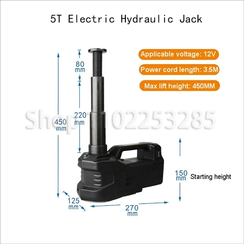 Notice: Remote area may cause extra shipping fee.Please Note: Import duties, taxes, and charges are not included in the item price or shipping cost.when the parcel arrived to your customs, please pay the tax and pick up the parcel, we are not responsible for any customs duty or import tax. Product parameters: Product Name: Single function electric hydraulic jack. Rated power: 150W Rated voltage: DC12V Maximum current: 13A Fuse: 15A Vehicle weight: 3T/5T Length of power cord: 3.5m Lifting range: 135-360MM/155-450MM Note: 1、360mm high is 3T jack, 450mm high is 5T jack; 2、Different batches of products may have different appearance labels and local structures, but their functions are the same and do not affect their use. Please refer to the actual product; 3、The size is measured manually, and there may be errors. Please refer to the actual product! Packing list: 1 * Electric jack Product display: