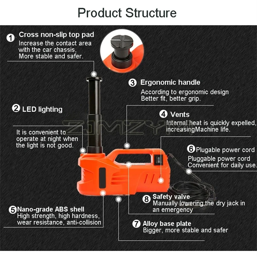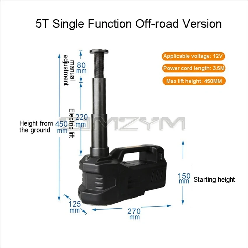 Name: 3T/5T single function electric hydraulic jack Rated power: 150W Rated voltage: DC12V Maximum current: 13A Fuse: 15A 135-360MM Carrying vehicle weight: 3T 155-450MM Carrying vehicle weight: 5T Power cord length: 3.54 meters Lifting range: 135-360MM/155-450MM Note: Our product voltage is DC12V, and some Japanese cars have low power, about 10V, so they may not be able to drive the product. Picture showing: