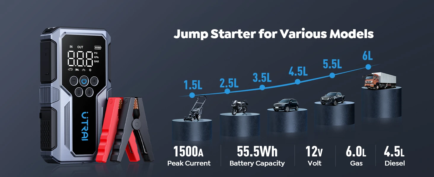 1500A Car Jump Starter Power Bank Portable 150PSI Air Pump Car Battery Emergency