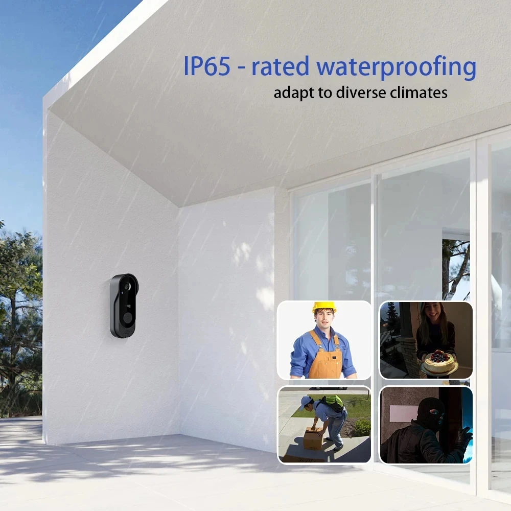 Specification: Connectivity Technology: Wi-fi,Tuya APP Feature: Waterproof Recommended Uses For Product: For surround sound systems Special Features: USB Port Wireless Communication Technology: Wi-fi Water Resistance Level: Waterproof Mounting Type: Wall mount Controller Type: Remote Control Power Mode: Battery Powered/USB Dual Use Operating Voltage: ≤36V wireless property: With Wi-Fi function Battery Properties: Rechargeable Battery Rechargeable Battery: Lithium Battery-Polymer Product Name: Wireless Smart Video Bell Camera Sensor lens: 170° wide-angle lens WiFi connection: support Ding Dong: support Storage: Support cloud storage function (hardware without TF card function) Wake-up method: doorbell button to wake up Video Ringtones: Internet smart doorbell camera mobile phone video call | image cloud storage | ultra-low power consumption and long standby | high-definition night vision | 170° wide angle Two-way video intercom: WIF intelligent setting, long-distance transmission, no need to open the door, video calls can be made with visitors outside the door through mobile phones, reducing accidents caused by accidental entry Cloud storage: Free circular image storage with unlimited cloud storage capacity, safe backup, support for classified viewing, downloadable local storage, and easy and fast viewing at any time. Package Included: 1 * Doorbell 1 * Ding Dong machine 1 * charging cable