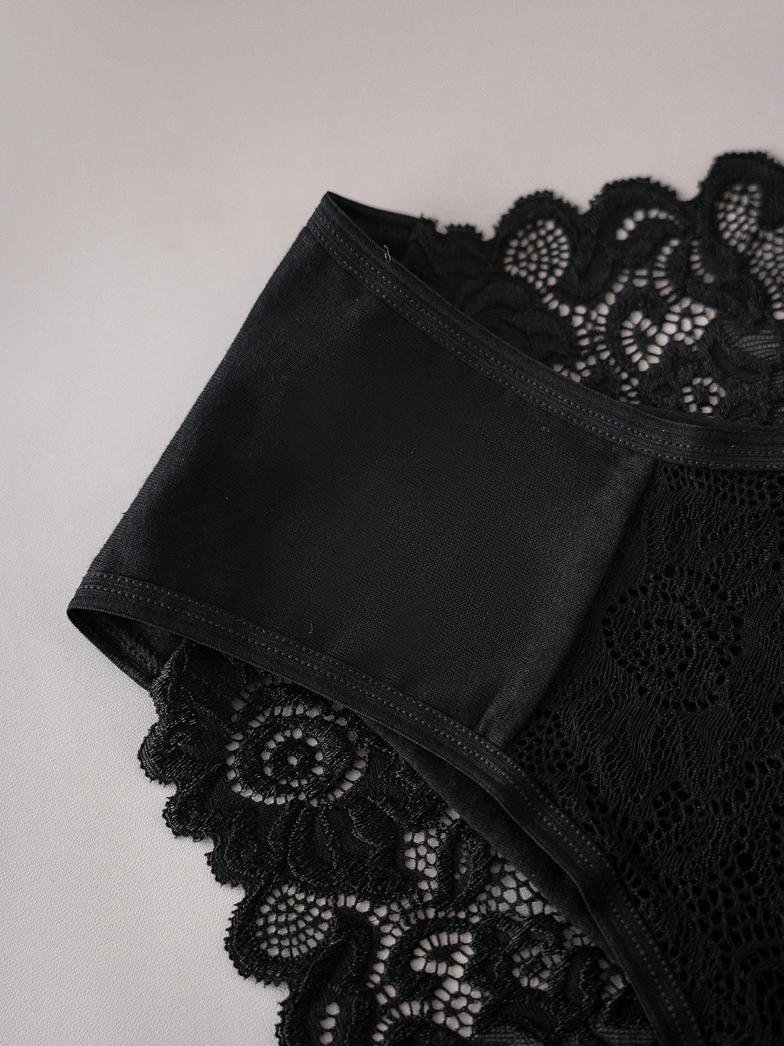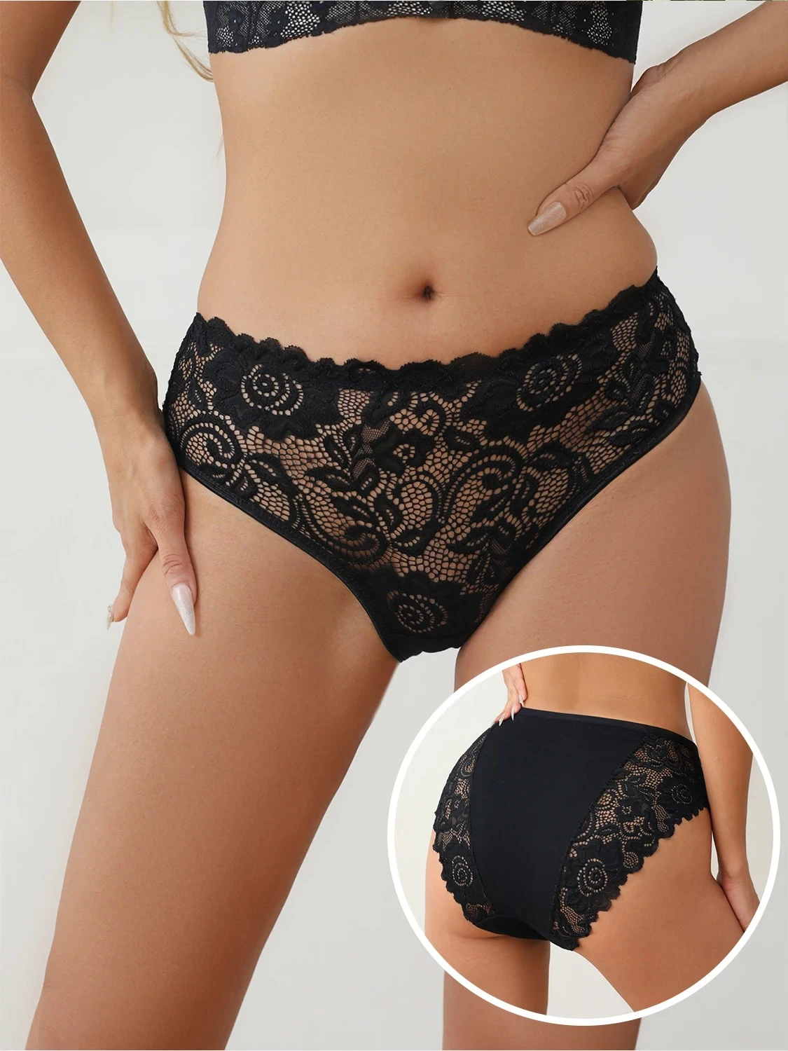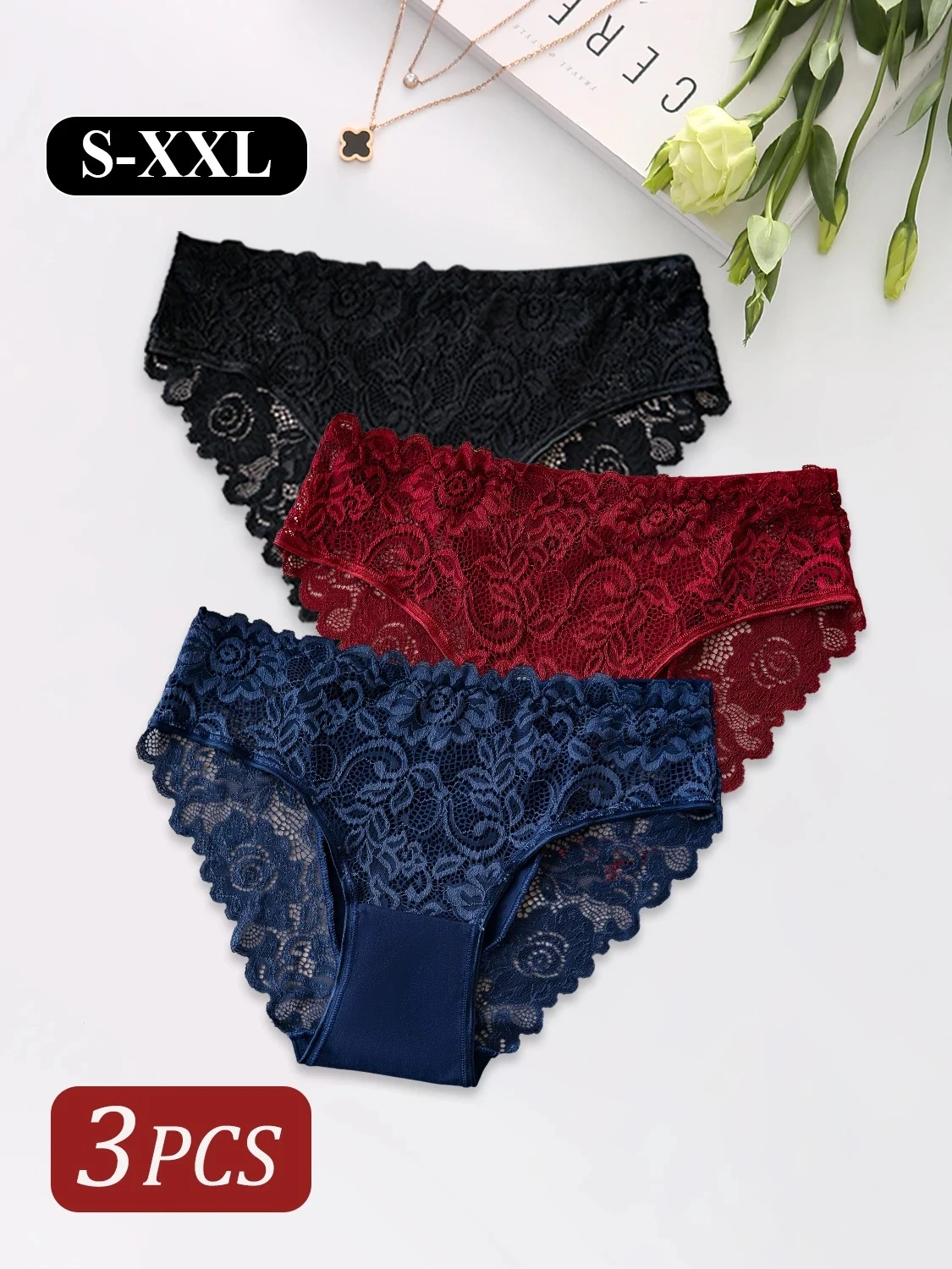 3PCS Cotton Women's Underwear Elegant Floral Lace Mid-Rise Panties Solid Color Hollow Out Sexy Briefs High Quality Lingerie