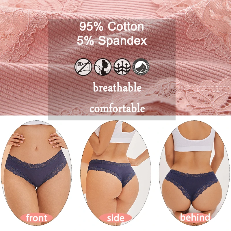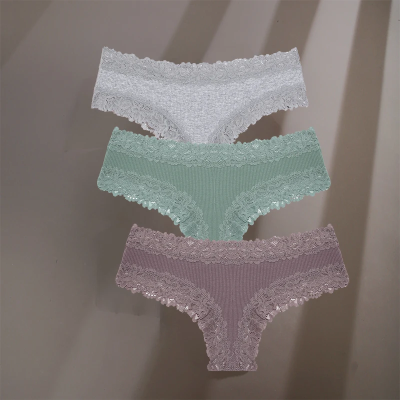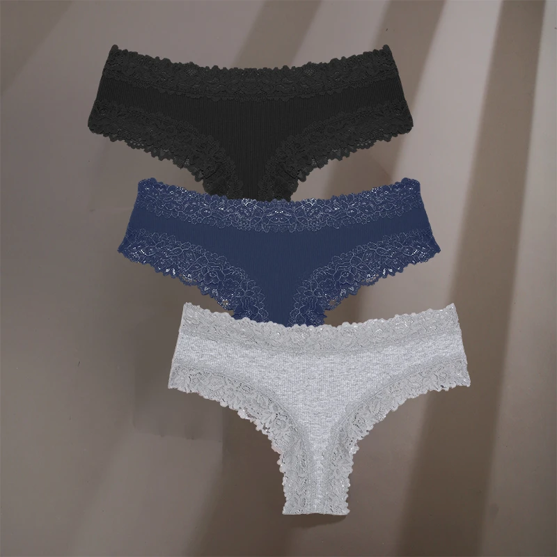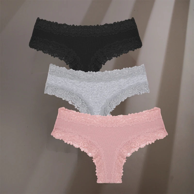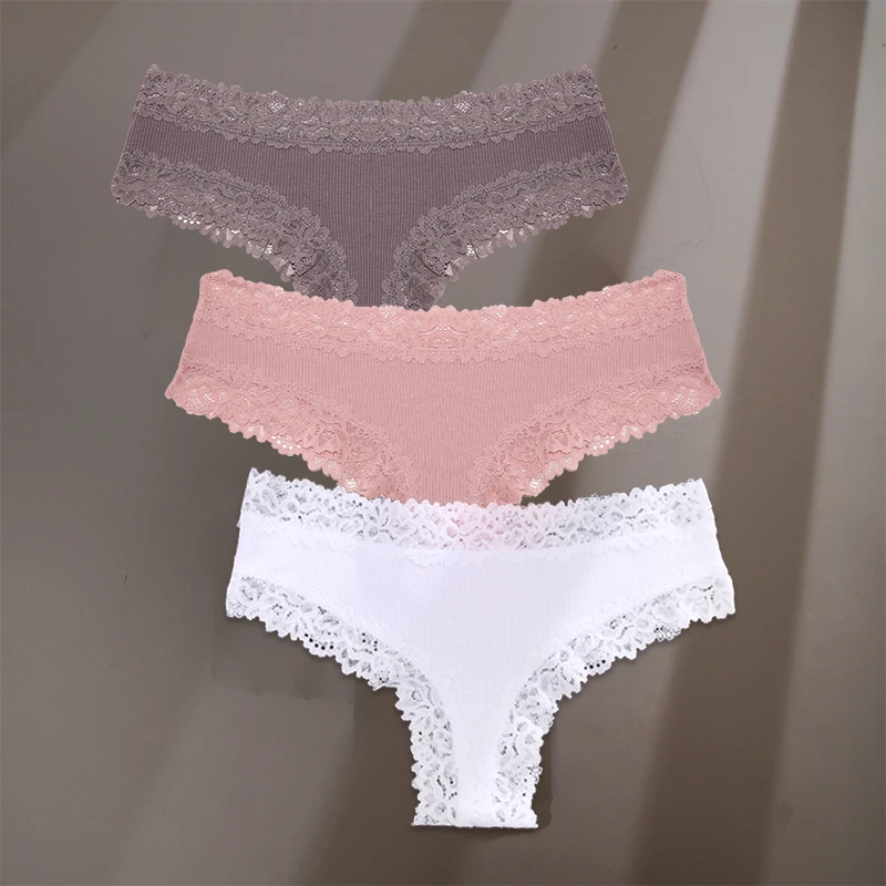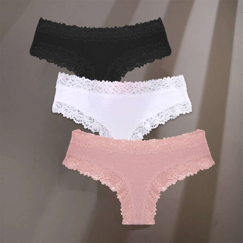 3PCS/Set Women Cotton Panties Floral Lace Brazilian Panties Sexy Low Waist Lingerie Female Soft Underwear Solid T-Back Bikini