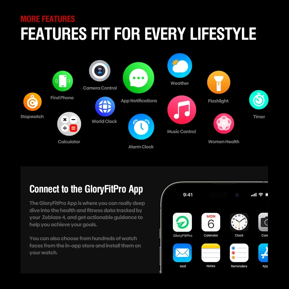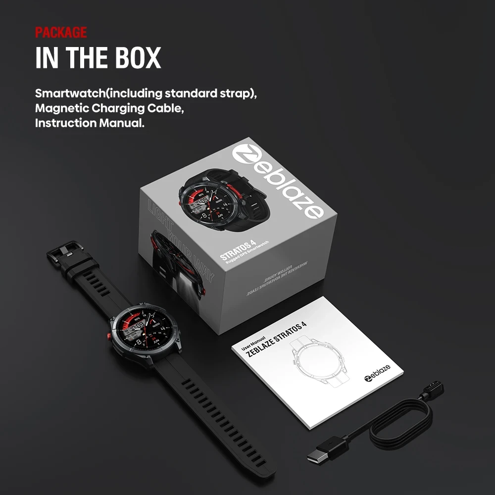Model: Zeblaze Stratos 4 Color: Abyss Black, Electric Orange Case Material: Metal Bezel+Drilling Carbon Coating + 316L Stainless Steel Screen Material: Corning® Gorilla® Glass Buttons: 3 Screen Material: 1.43'' AMOLED Screen Resolution: 466*466 pixels, 391 PPI, Up to 1000 nit Brightness Support Always-on Displays Sensors GPS: Built-in GNSS & 6 Satellite Positioning Systems (GPS, GLONASS, GALILEO, NAVIC, QZSS, BDS) Assisted GPS for fast fix times. Movement: Compass, Gyroscope sensor, Geomagnetic sensor, Barometric altimeter, Acceleration sensor. Health: Wrist Heart Rate Monitor, Pulse Ox Blood Oxygen Saturation Monitor. Flashlight: Support Speaker and Microphone: Support Connection: BLE 5.3 Battery Capacity: 500 mAh Li-Pol battery. Charging Method: Charging Cable Charging Time: Approx. 1.5 hours Materials: Durable and comfortable silicone strap Width: 22 mm Min. & Max. Wrist Dimensions: 130-235 mm Health Features Activity Tracking: Activity Record, Step Counter, Standing, Move Bar (Displays on device after a period of inactivity; Walk for a couple of minutes to reset it, Auto Goal (Learns your activity level and assigns a daily step goal), Calories Burned, Real-time Pace & Distance. 24H Monitoring: Wrist-based Heart Rate (Abnormal Heart Rate Alerts), Step, Standing, Calories Burned, Real-time Distance. Manual Measurement: Wrist-based Heart Rate, SpO2(Blood Oxygen) Level Measurement, Stress Level. Sleep Quality Monitoring: Sleep stages (including REM), Daytime naps, Sleep schedule, Sleep Score and Insights. Breathing Exercise: Support Menstrual Cycle Tracking: Support Sports Modes: 170+ Lifestyle Features Smartphone Assistance: Bluetooth Phone Calls, Voice Assistant, Controls Smartphone Music and Camera, Phone Call Notifications, SMS Notifications, App Notifications, Find My Phone. Timing: World clock, Time/Date, GPS Time Sync, Automatic Daylight Saving Time, Stopwatch, Timer, Alarm Clock. Daily Life: Weather Sync(Check weather in the next 7 days), Flashlight, Calculator, Password Setting, Raise to Wake. Modes: Power Saving Modes, Do Not Disturb Modes, AOD Modes, Screen Locked Modes, Silent Modes. APP: GloryFitPro Supported Devices: Android 5.0 or iOS 11.0 and above. Review & Share Your Activity: Sync Workout Data to Apple Health & Strava. Watch Faces System Default: 7 GloryFitPro APP Download: 500+ Always-on Displays: 20 Customize Watch Faces: Support Watch System: English, Portuguese, Russian, Polish, Spanish, French, Italian, German, Dutch, Turkish, Bengali, Indonesian, Thai, Czech, Hebrew, Hungarian, Romanian, Vietnamese, Finnish, Norwegian, Swedish, Danish, New Zealand, Greek, Arabic, Ukrainian, Korean, Japanese, Simplified Chinese, Traditional Chinese. Packing List: Smartwatch (including standard strap), Charging Cable, Instruction Manual. Operating Temperature: From -40°C to 50°C. Temperatures below -40°C may affect battery life and performance. |