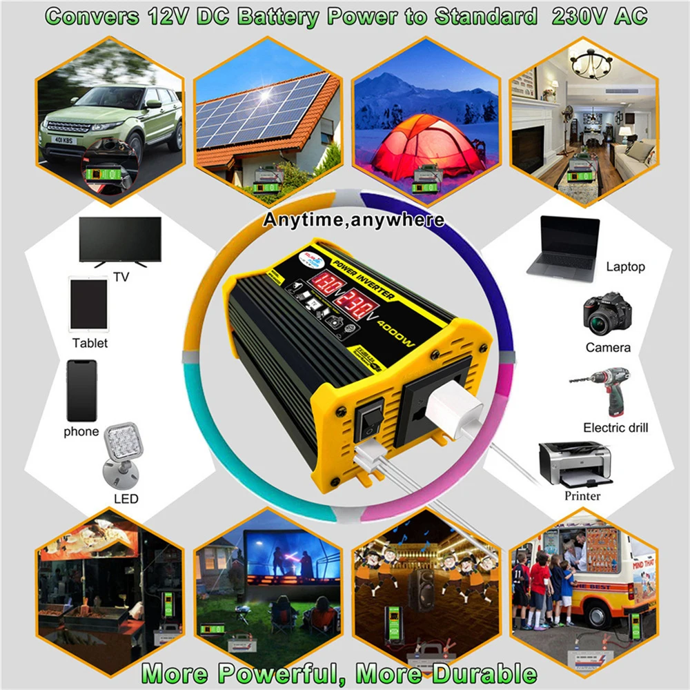 LED Digital Voltage Display 4000W Car Power Inverter DC 12V to AC 220V/110V Portable Dual 2 USB Converter Adapter Feature: - 12V is generally for cars, 24V for trucks, 48V and 60V is generally for electric vehicles. - Available Ranges Of Rated Voltage Of Electrical Appliances : 110V 220V - Safe Ranges Of our inverter Input Voltage:12V (9.8-15V)