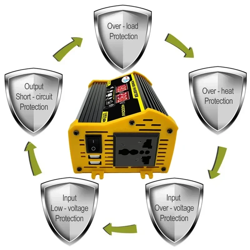 [Multi Protection]Built-in fuses, safe charging design andcooling fan prevents the car power converter from over-heat,saving power and energy.over voltage, overload, over-current,short circuiting,under-voltage, overheating, short circuit protection.