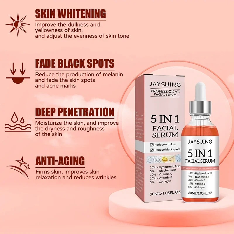 5 In 1 Face Serum Hyaluronic Acid Moisturizing Brightening Vitamin C Essence Lighten Melasma Fade Fine Lines Shrink Pores Serum