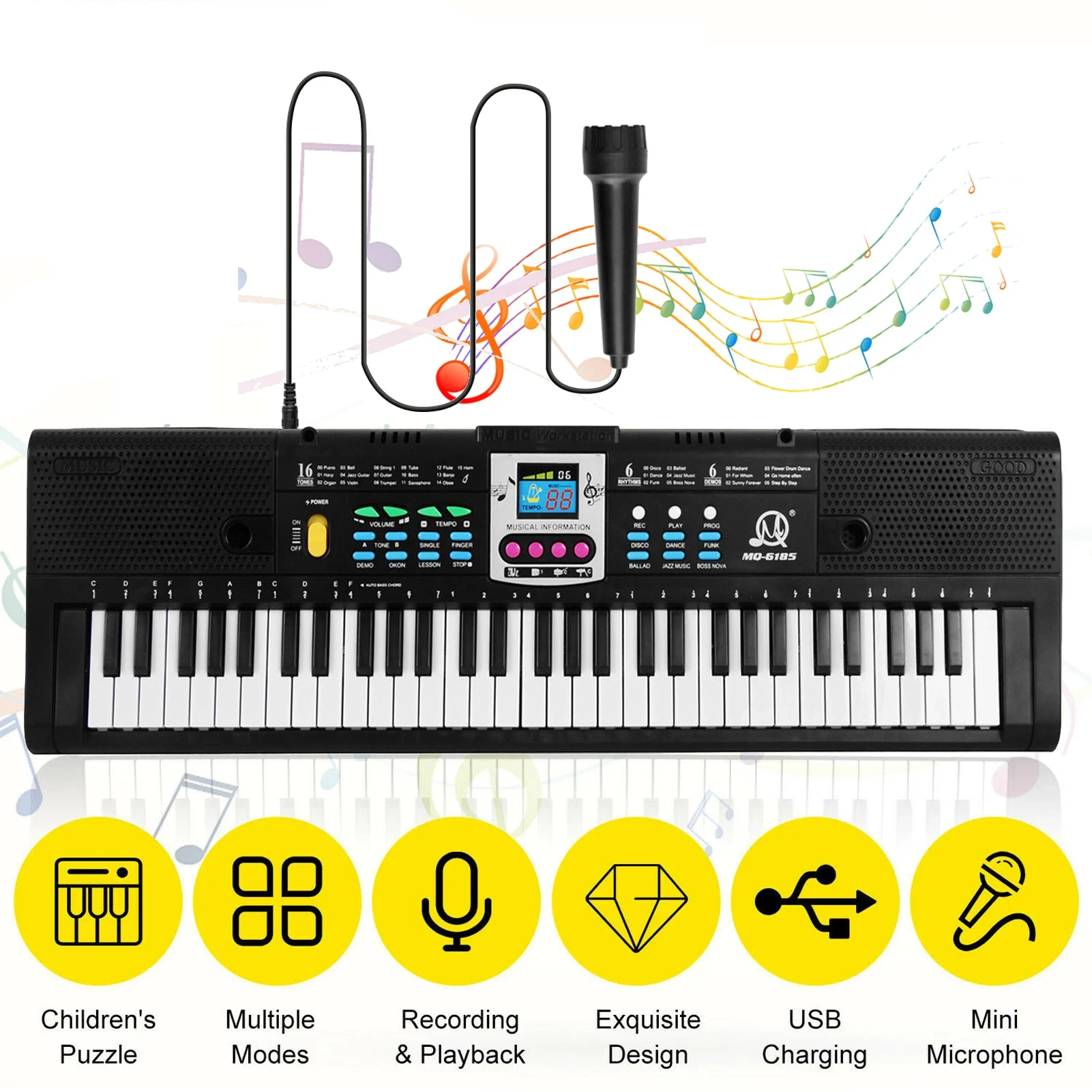 Specification: This electric piano is a very suitable gift for a piano beginner. It is comfortable to use, does not hurt your fingers, and has a rich tone, which is very suitable for piano practice. Features: Stylish appearance, easy to carry, easy to clean, and easy to maintain. It can let the child learn rich music knowledge, develop the sense of rhythm, train the coordination of left and right hands, so that beginners can master the basic standard playing skills. This piano is small size and is portable and convenient to learn by students. It can cover the needs of children and primary school students. Keys with the same height and a certain sense of depression, and strengthening finger exercises. 16 tones and 10 rhythms. External devices such as microphones can be connected, and parents can prepare their children's favourite songs and sing them while playing. Specifications: Colour: black+white Material: plastics Keys: 61-keys Tone: 16 Rhythms: 10 Percussions: 4 Demos: 6 Battery: 4 * AA battery (not included) Item size: 500 * 145 * 40mm / 19.7 * 5.7 * 1.6in Item weight: 500g / 1.1lb Package size: 575 * 155 * 44mm / 22.6 * 6.1 * 1.7in Package weight: 700g / 1.5lb Packing List: 1 * Electronic Keyboard Piano 1 * USB Cable 1 * User Manual 1 * Microphone Package List: 1 * Electronic Keyboard Piano 1 * USB Cable 1 * User Manual 1 * Microphone