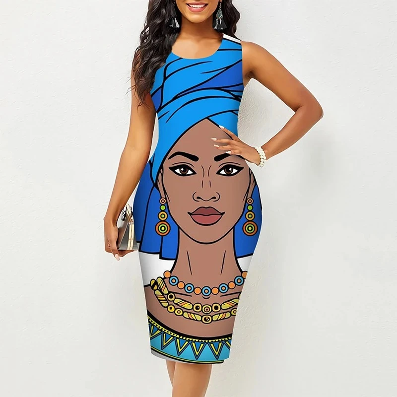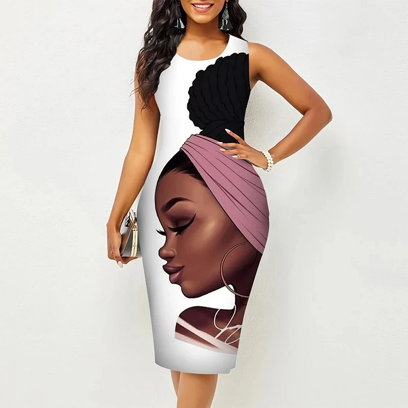 African Black Girls 3D Print Sexy Knee Length Dresses Women Slim Fit Party Dress Sleeveless Girl Elegant Formal Occasion Dresses |