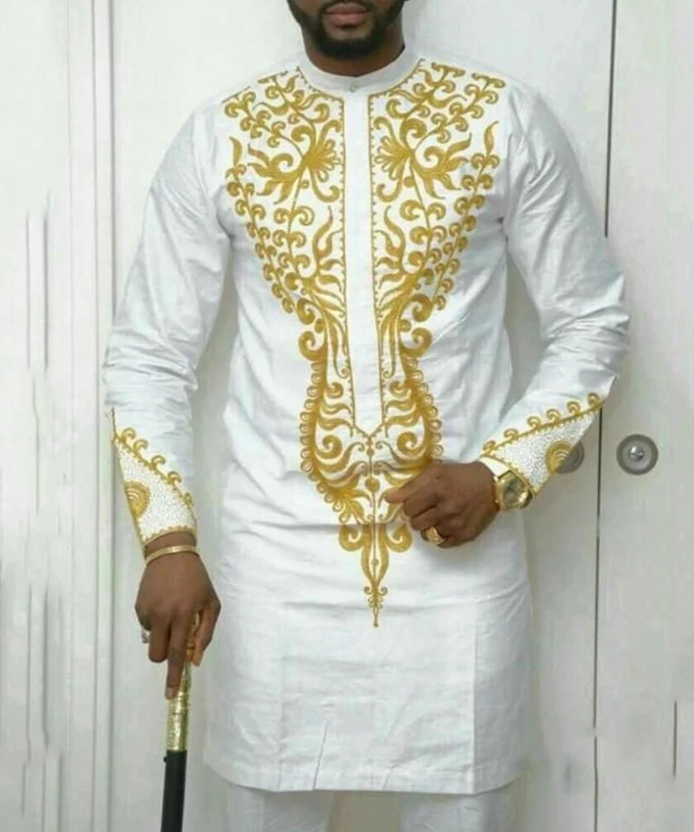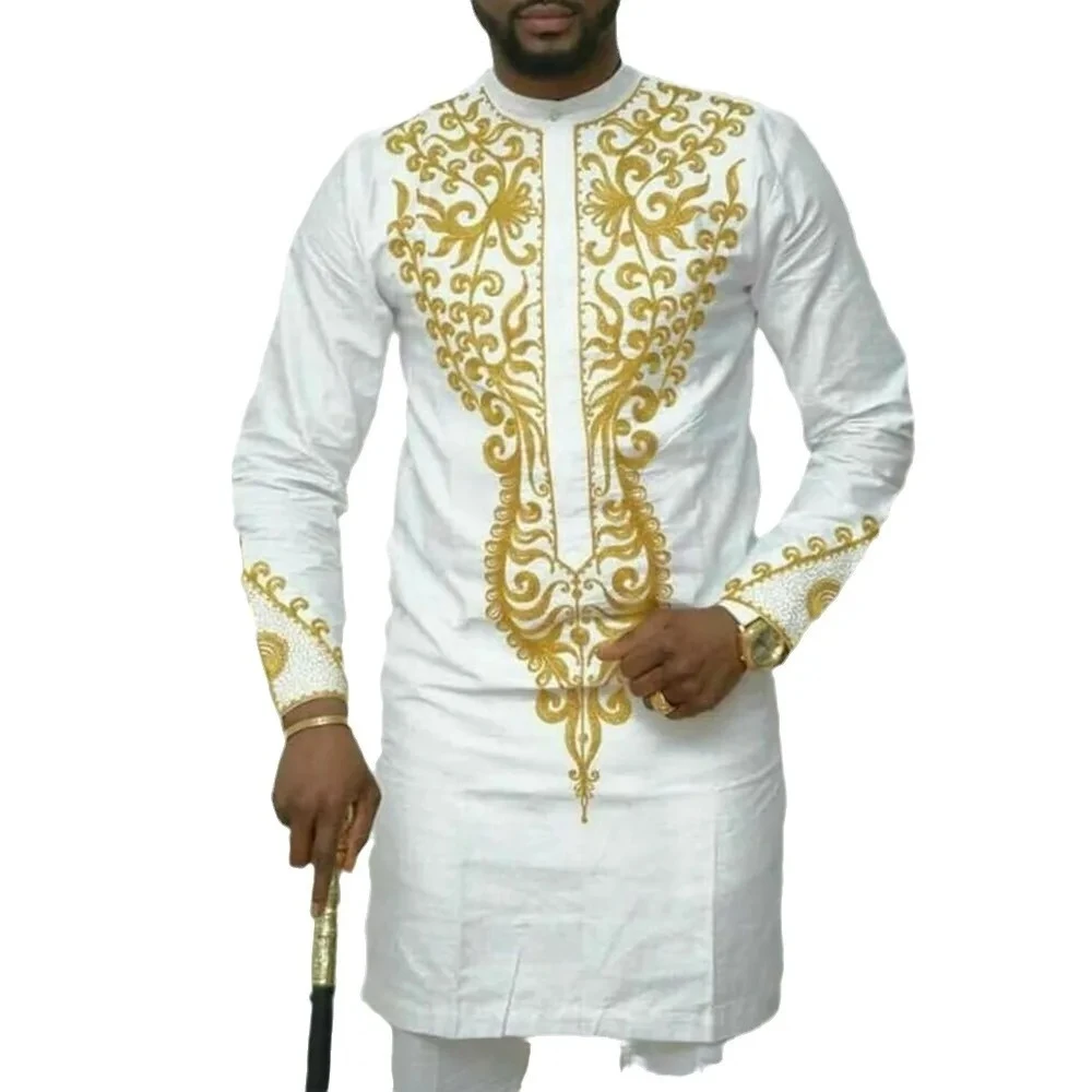 African Men Embroidery Shirt Outfits Africa Long Sleeve Round Collar Top Pants Two Piece Traditional Ethnic Party Wedding Suit