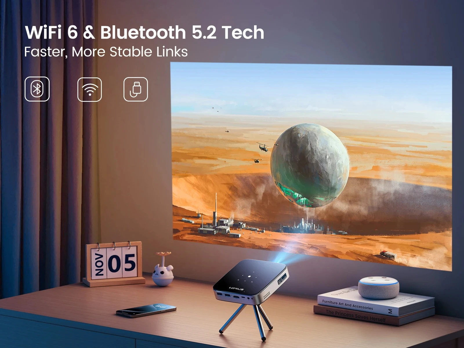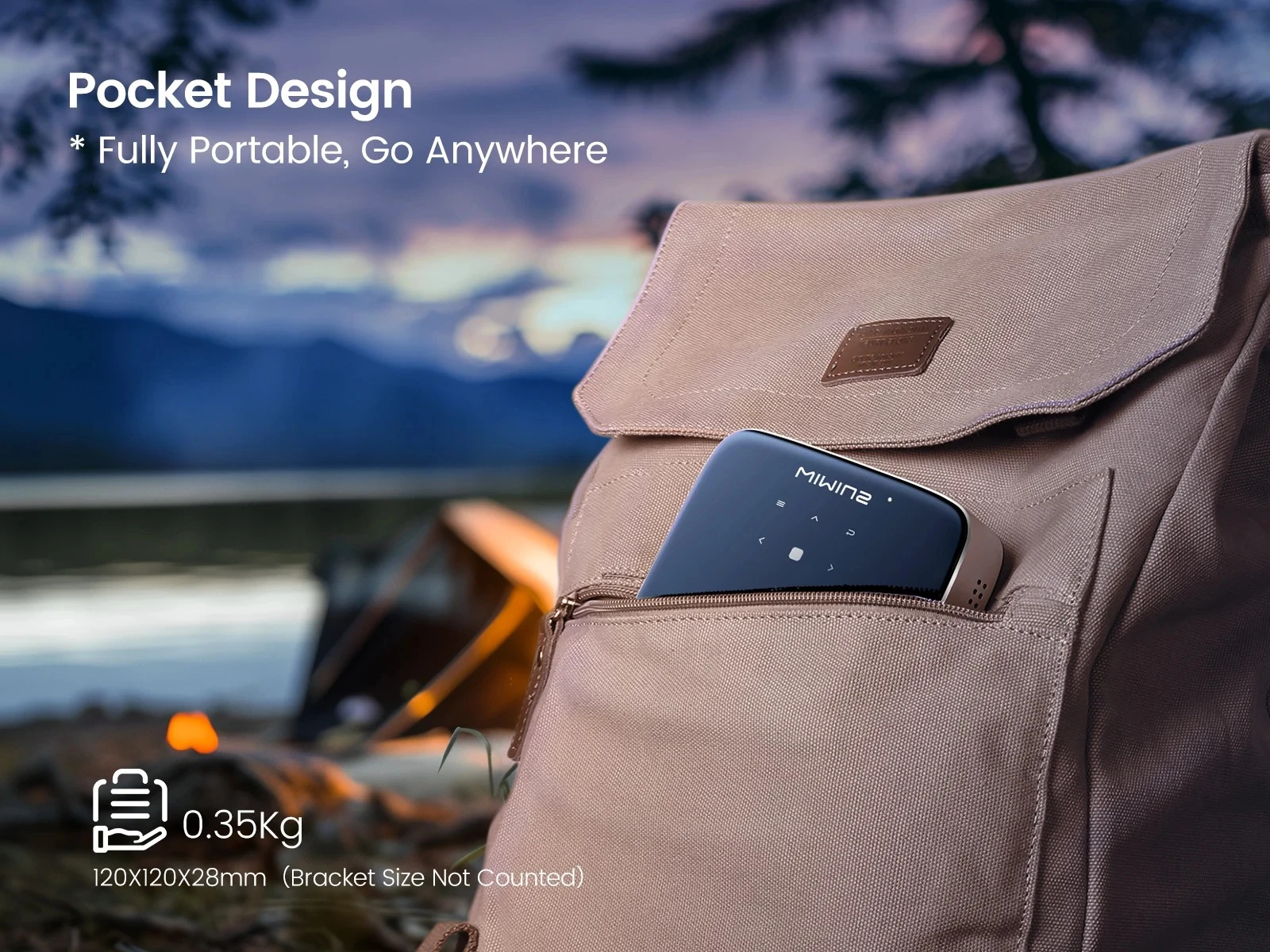 【Android TV 11.0 Mini Portable DLP Rechargeable Projector, Built-in Battery 3H Battery Life】This WiMiUS mini wifi bluetooth projector has a built-in Android TV 11.0 system, you can easily access streaming videos from 10,000+ Apps such as Neflix, Disney, Prime Video, YouTube, etc. to enjoy your favorite movies, sports events and shows at any time. Thanks to the built-in rechargeable battery, you can enjoy 3 hours of movies/videos on a single charge, and it supports charging with a power bank, which makes it an ideal companion/excellent gift for bedrooms/outdoor camping/travel. 【Ultra Short Throw Portable WiFi Bluetooth Projector, Automatic Vertical Keystone Correction, 50%-100% Zoom Function】This mini projector measures only 12 x 12 x 2.8cm and weighs about 0.35kg, making it easy to carry, and with its ultra short throw advantage, you can project it on the desk/wall or ceiling at will, and enjoy movies/sports games/video games with your family or friends anytime and anywhere. In addition, the 1080p portable wifi projector has an automatic vertical keystone correction function, so you can enjoy a clear and perfect rectangular image in just a few seconds. 【DLP Portable WiFi Bluetooth Full HD Projector Supports 1080P, Fully Enclosed Dustproof Optical Projector】The short throw projector has a projection size of up to 150'' (0.3-3m), with a 360° rotating tripod provided, meeting your multi-scene projection needs, enjoy movie nights anywhere. This projector has a brightness of 400 ANSI lumens, a contrast ratio of 20000:1, supports a maximum resolution of 1080p. Advanced DLP color technology can provide richer colors and more detailed images, and the fully sealed and dustproof optical technology can effectively reduce black spot problems. 【Ultra-Fast WiFi6 Connection Projector, Bluetooth 5.2, Touch Screen】The projector supports AirPlay, Miracast and EShare for wireless screen mirroring of your iOS/Android phone/Tablet/iPad, the latest WiFi6 and 60Hz refresh rate provides a smoother and faster video/gaming experience. And Bluetooth 5.2 allows the projector to wirelessly connect to Bluetooth headphones/speaker/Airpods for superior sound quality when playing outdoors, the touch screen design makes it more convenient to use. 【Portable Android TV Projector with Multi-Interface, 3-Year Warranty】In addition to the built-in Android TV system, the portable wifi bluetooth projector