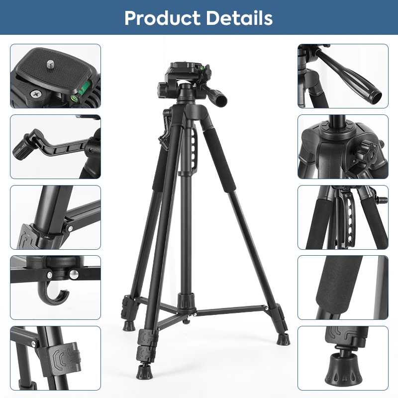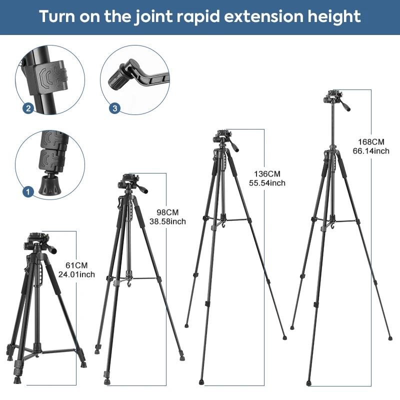Camera Tripod 168cm, Professional Adjustable Aluminium Alloy Mobile Phone Tripod With Carry Bag And Bluetooth, For Phone/Cameras Product specification: Product name:Camera Tripod 168cm Material: Aluminum alloy and ABS Maximum load capacity: 5 kg / 11 lbs Section: 3 Maximum working height: 168 cm / 66 inches Minimum working height: 61 cm / 24 inches Pan angle: 360° Tilt angle: 90° (downward); 65° (Up) Package weight: 800g Features: The camera tripod has a 360-degree rotation feature that allows for tilt and rotation movements, Portrait or landscape options. The height can be adjusted, with a maximum height of 168 cm (66 inches) and a minimum height of 61 cm (24 inches). Quick Release Plate - Helps install and remove the camera in seconds. It enables quick transitions between shots and rapid movement from one point to another. The built-in bubble level facilitates precise horizontal alignment. Standard 1/4-inch screws fit most cameras, plus the phone can be mounted via the phone clip. The tripod is made of lightweight and sturdy aluminium, and the handbag is easy to carry for travel. Product List: 1*168cm camera tripod 1*Bluetooth 1*Phone clip 1*Carrying bag