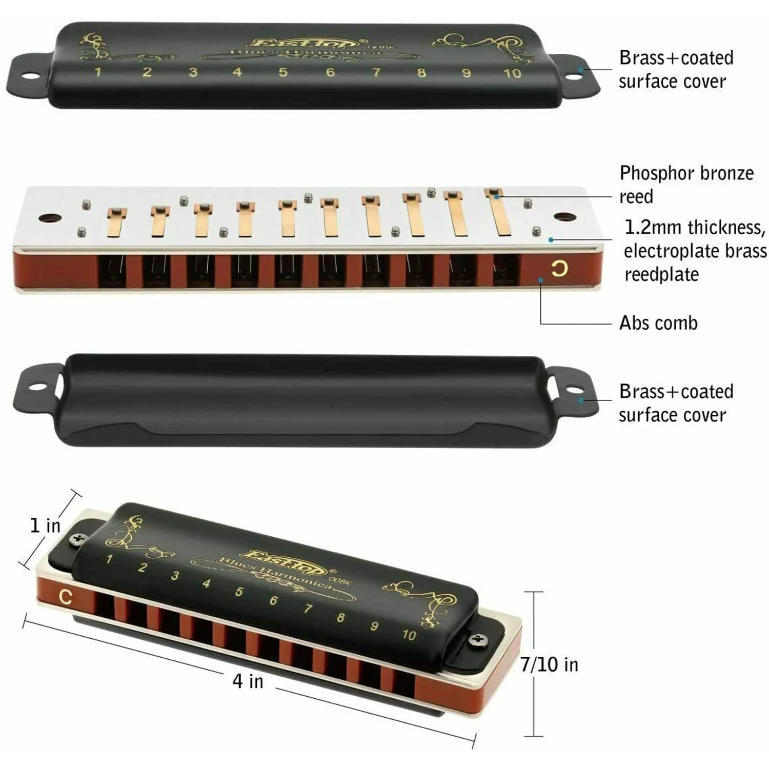 This Easttop 10 Hole Diatonic Blues Harmonica with rich sound and timbres, 1.2mm thickness reed plate is easier to get the higher pitch, suitable for Blues, Folk, Rock, Country, Jazz etc. Come and experience the melodious sound festival.