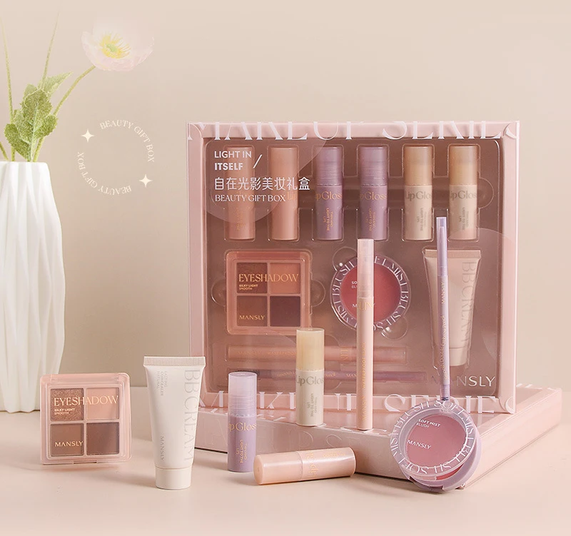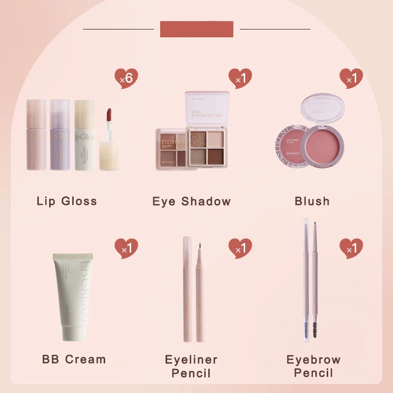 | Beginner beauty set gift box What's included: Eyeshadow, lipstick, BB cream, Eyeliner, eyebrow pencil, blush Get your makeup, so easy! ☆ Specification: Name: Makeup Set Weight: 360g Net content: Lip Gloss:3.5g*6 Eyeshadow: 1.2g*4 Blush: 5.8g BB Cream: 20g Eyebrow Pencil: 0.04g Eyeliner :0.8g ☆ Package included: Makeup Set x 1 ☆ Notes: 1. Please do not use it for any purpose other than makeup. 2. Please do not place in direct sunlight or in a place where the temperature is too high or too low. 3. Keep out of reach of children. Due to differences between different monitors, the picture may not reflect the actual color. Compare the detail dimensions to your dimensions, allowing for an error of 1-3cm due to manual measurement. If there is a problem with the product, please leave a comment before giving negative feedback. Thank you for your understanding and support~