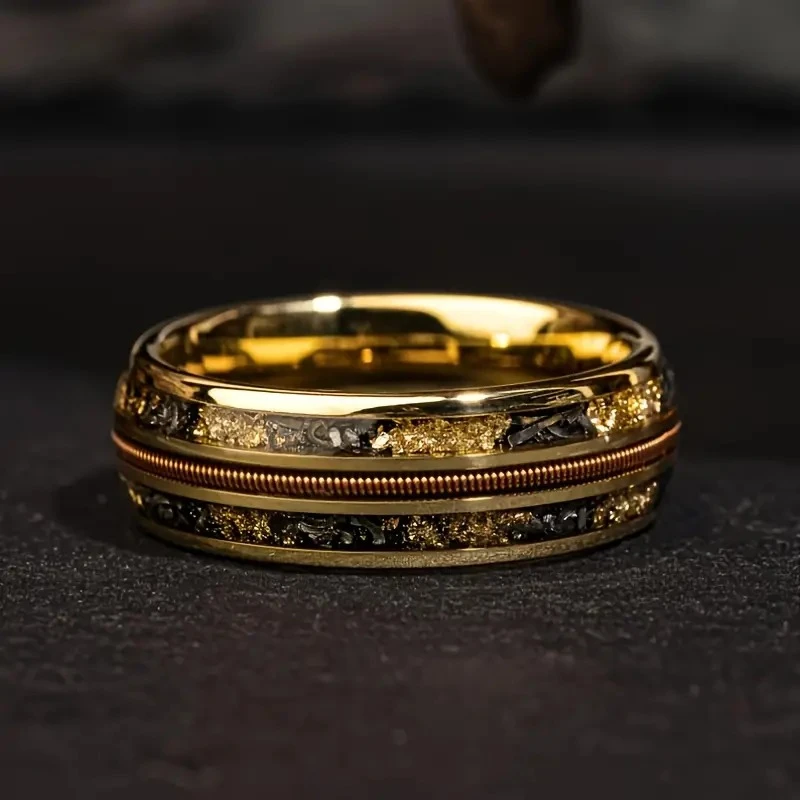 Fashion 8mm Gold Color Stainless Steel Guitar string Rings for Men Inlay Simulat