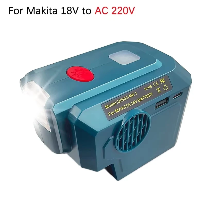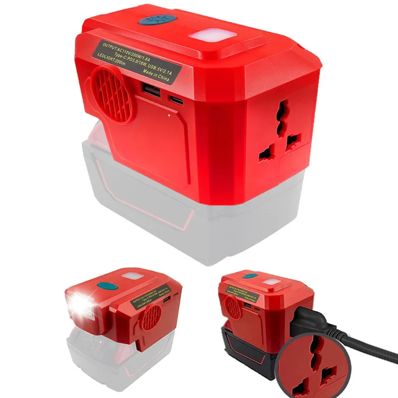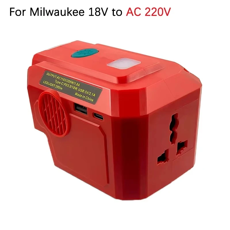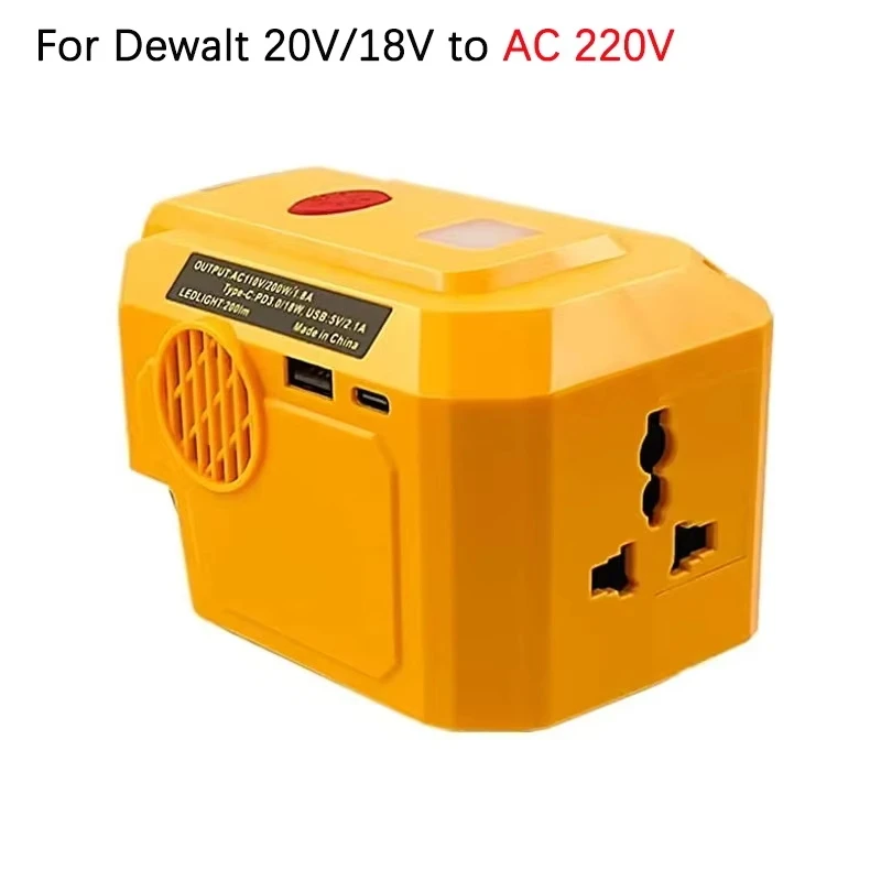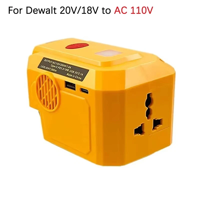 200W 110/220V Power Inverter for Makita/Bosch/Dewalt/Milwaukee 18V Li-ion Battery Portable Modified Sine Wave Inverter Generator Description: Power Inverter Generator- The 200W modified sine wave portable power generator has USB & Type-C ports, an LED light, DC 18V to AC 110V /220V Outlet for device charging. Modified sine wave is faster and steadier. Feature: 【DC to AC output port】The output voltage of this small generator adapter is 110V-120V(US Plug),220V(EU Plug), 200W.Compatible small electronics, such as cell phones, tablets, laptops, radios, small fans and LED lights, etc. 【LED Work Light】Equipped with 200LM LED work light.(Press the white On/off button first,then the red button). 【Multiple Protections】This power inverter built-in multiple protections, such as over-voltage protection, over-current and over-temperature protection, etc. The power inverter will shut off automatically when it detects a short circuit or over temperature up to 80℃. Be safe for your daily use. Compatible with: This power supply inverter only works for Makita/for Dewalt/for Milwaukee/for Bosch/for Black&Decker 20V and 18V lithium batteries. (Battery not included) Specification: Power Rating:200 W Material: ABS+PC LED light: 200 lumens Power Source: for Makita/for Dewalt/for Milwaukee/for Bosch/for Black&Decker 20V 18V Li-ion Battery.(battery not included) Inverter socket:200W, 110V/AC or 220V/AC.(Options) Type: Inverter, Portable Package Includes: 1 * Power Supply Inverter (battery not included) Note: * It needs to press the "white button" first to use the other USB or LED function. When the battery power is lower than 16V, the USB and LED lights cannot work anymore. * The power inverter can't charge your battery. * Please remember to remove the battery when not in use. ![]()