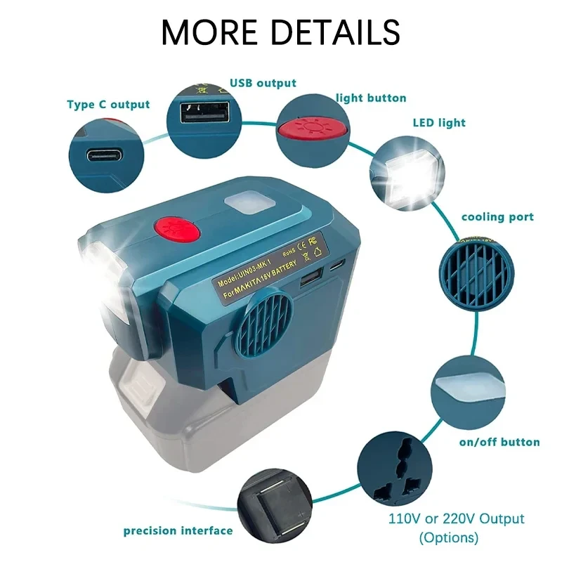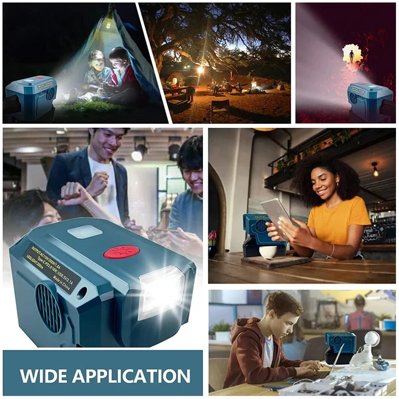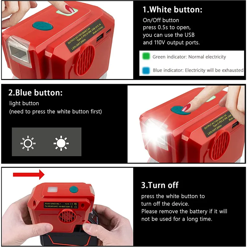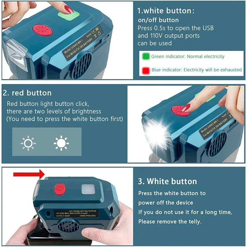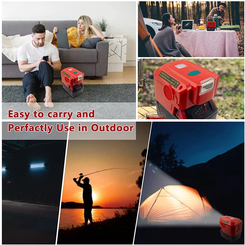 200W 110/220V Power Inverter for Makita/Bosch/Dewalt/Milwaukee 18V Li-ion Battery Portable Modified Sine Wave Inverter Generator Description: Power Inverter Generator- The 200W modified sine wave portable power generator has USB & Type-C ports, an LED light, DC 18V to AC 110V /220V Outlet for device charging. Modified sine wave is faster and steadier. Feature: 【DC to AC output port】The output voltage of this small generator adapter is 110V-120V(US Plug),220V(EU Plug), 200W.Compatible small electronics, such as cell phones, tablets, laptops, radios, small fans and LED lights, etc. 【LED Work Light】Equipped with 200LM LED work light.(Press the white On/off button first,then the red button). 【Multiple Protections】This power inverter built-in multiple protections, such as over-voltage protection, over-current and over-temperature protection, etc. The power inverter will shut off automatically when it detects a short circuit or over temperature up to 80℃. Be safe for your daily use. Compatible with: This power supply inverter only works for Makita/for Dewalt/for Milwaukee/for Bosch/for Black&Decker 20V and 18V lithium batteries. (Battery not included) Specification: Power Rating:200 W Material: ABS+PC LED light: 200 lumens Power Source: for Makita/for Dewalt/for Milwaukee/for Bosch/for Black&Decker 20V 18V Li-ion Battery.(battery not included) Inverter socket:200W, 110V/AC or 220V/AC.(Options) Type: Inverter, Portable Package Includes: 1 * Power Supply Inverter (battery not included) Note: * It needs to press the "white button" first to use the other USB or LED function. When the battery power is lower than 16V, the USB and LED lights cannot work anymore. * The power inverter can't charge your battery. * Please remember to remove the battery when not in use. ![]()