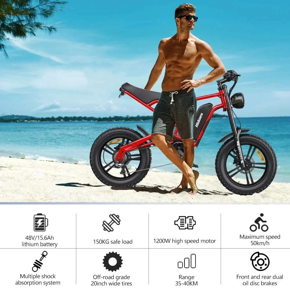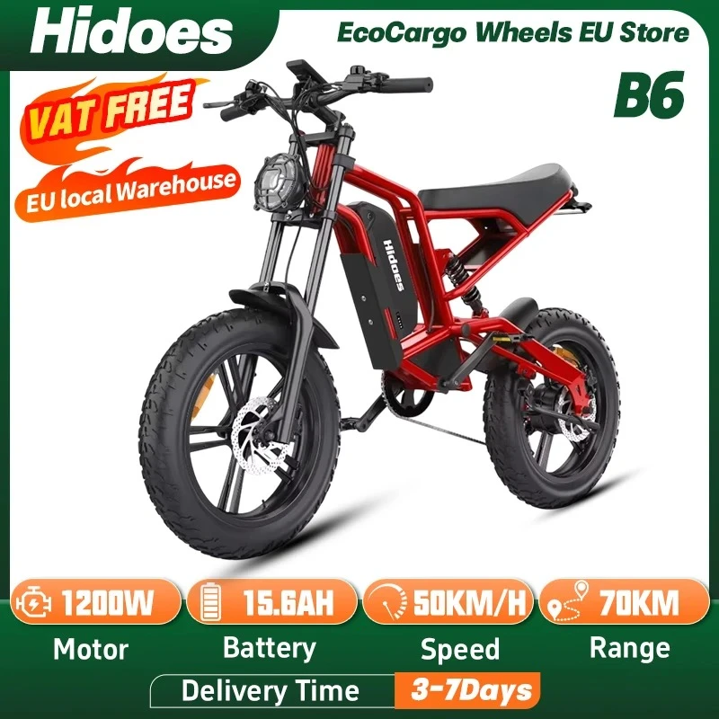 Brand Name: Hidoes Model: HIDOES B6 Color: Red Maximum Load: 150kg Maximum Speed: 25km/h / 50km/h ,Bicycle speed can be adjusted according to local laws and regulations (25 km/h) Battery Range: 35-40KM PAS Range: 50-70km Waterproof Level: IP54 Battery Type: 18650 Lithim Battery Brand SINCPOWER Battery Capacity: 15.6ah Battery Rated Voltage: 48V Motor Power: 1200w Motor Type: 1200w Brushless Gear Hub Motor Charging Time: 6~8Hours Ride Mode: Pure Electric Power Driving + Pedal Assist+Pedal Pedal Assist: Pedal Assist System 5 Speed Level Throttle: Turn the throttle Rear Light: Tail light & Brake Light Gear: 7 SPEED 14-28T Package Size: 149.5cm*30cm*79cm Gross/Net: 50kgs/43kgs